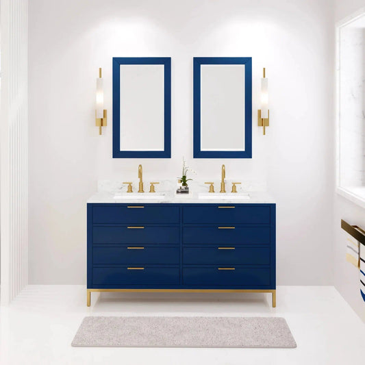 Water Creation Bristol 60'' Double Sink Carrara White Marble Countertop Bath Vanity in Monarch Blue with Satin Gold Gooseneck Faucets and Rectangular Mirrors (S)