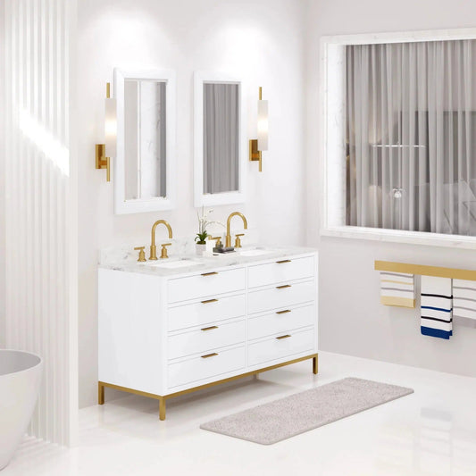 Water Creation Bristol 60'' Double Sink Carrara White Marble Countertop Bath Vanity in Pure White with Satin Gold Hook Faucets and Rectangular Mirrors (S)