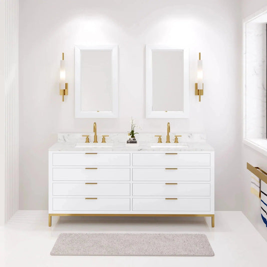 Water Creation Bristol 72'' Double Sink Carrara White Marble Countertop Bath Vanity in Pure White with Satin Gold Gooseneck Faucets and Rectangular Mirrors (S)