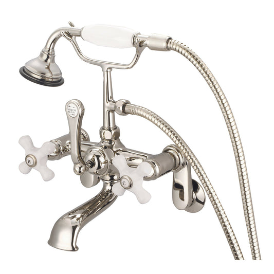 Water Creation Vintage Classic Spread Wall Mount Tub F6-0010 7" Silver Solid Brass Faucet With Straight Wall Connector And Handheld Shower And Porcelain Lever Handles Without Labels