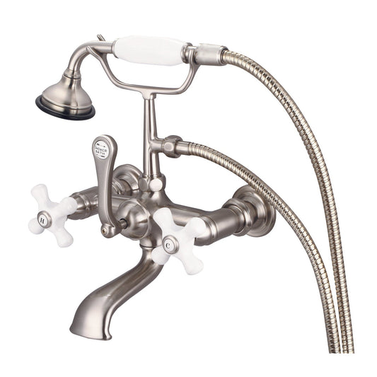 Water Creation Vintage Classic Spread Wall Mount Tub F6-0010 7" Silver Solid Brass Faucet With Straight Wall Connector And Handheld Shower And Porcelain Cross Handles, Hot And Cold Labels Included