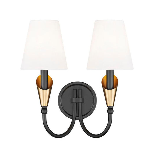 Z-Lite Claudelle 2-Light Candelabra Bulb Base Matte Black and Modern Gold Steel Frame White Fabric Shade Wall Sconce