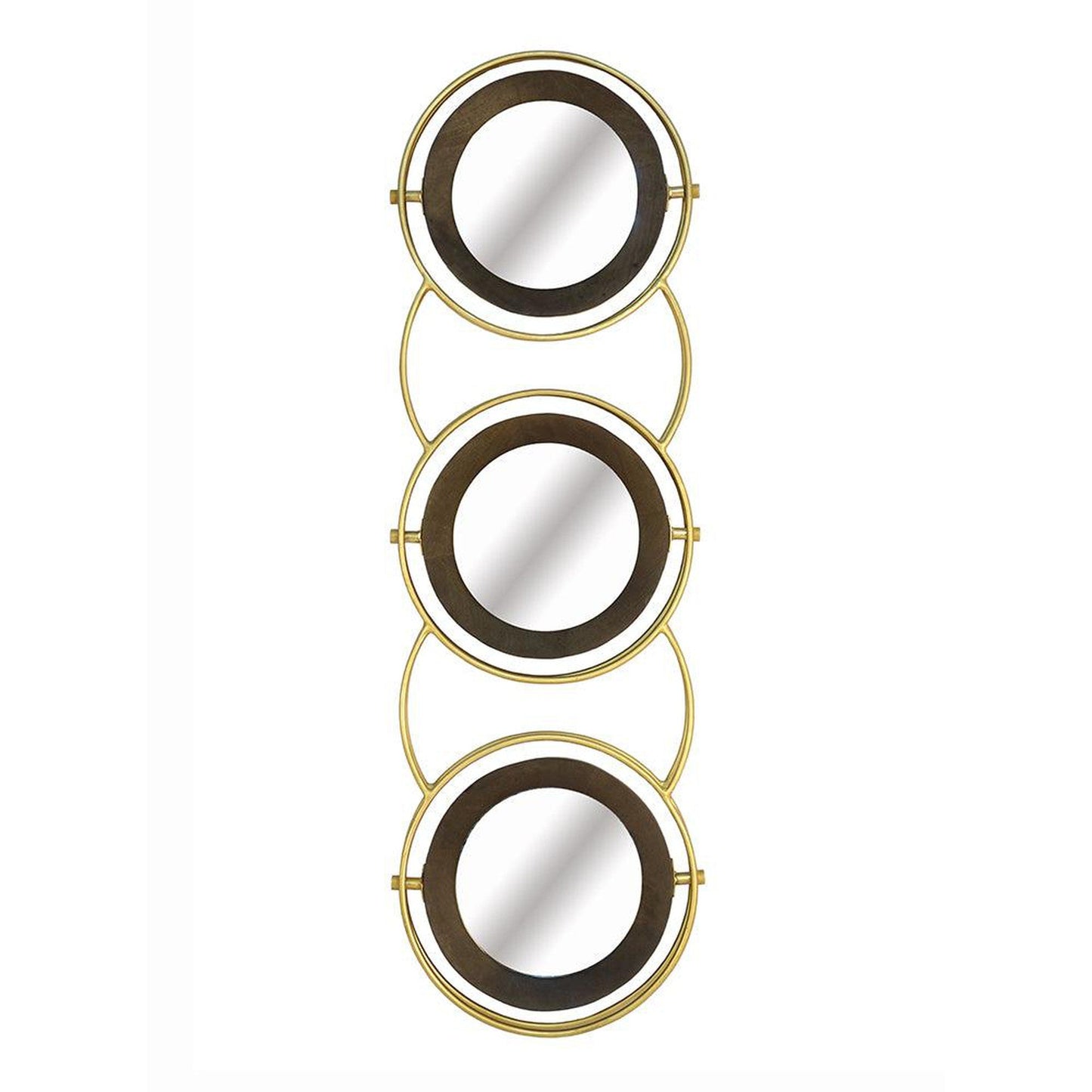 Create visual interest and clean, modern style with the Fallen three-ring accent mirror. Crafted of solid wood and metal, this mirror features three circular mirrors with mango wood frames and concentric metal outer rings. Rounding out the design, two additional gleaming gold overlapping circles bring these mirrors together in a brilliant reflection of great design.