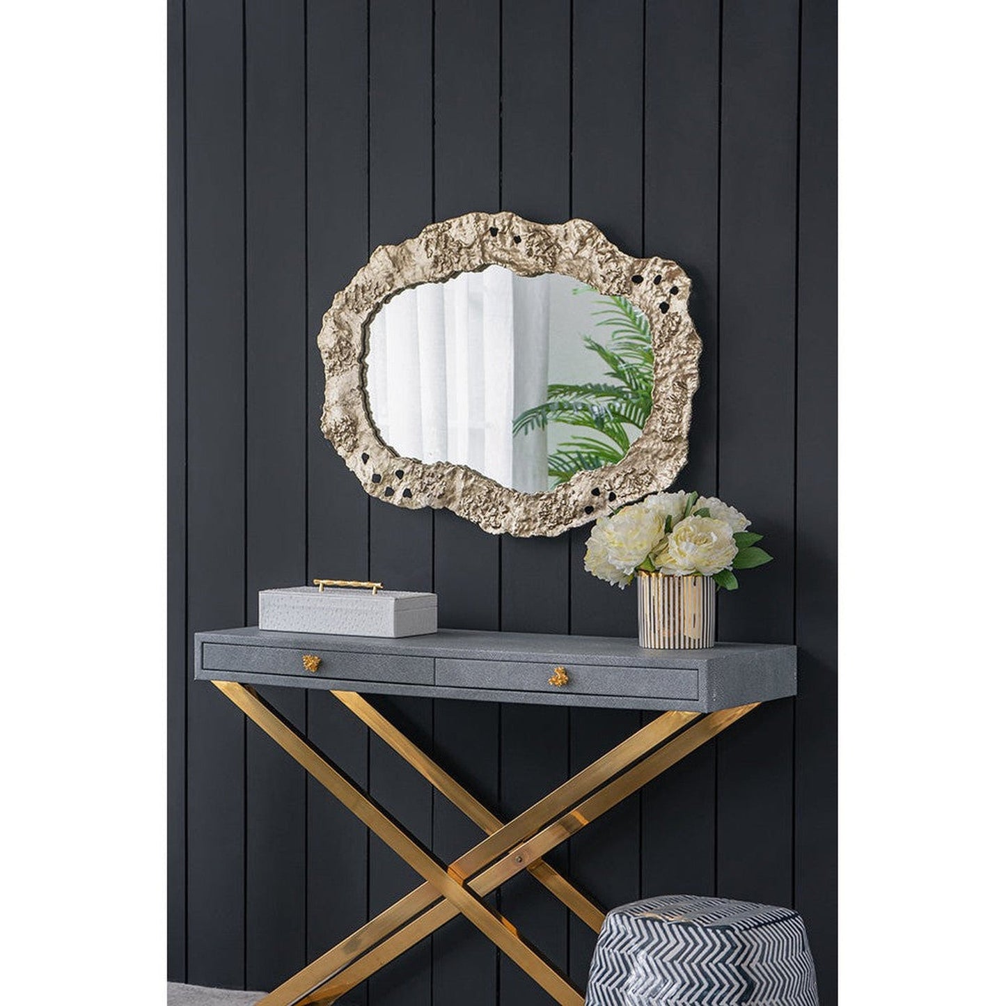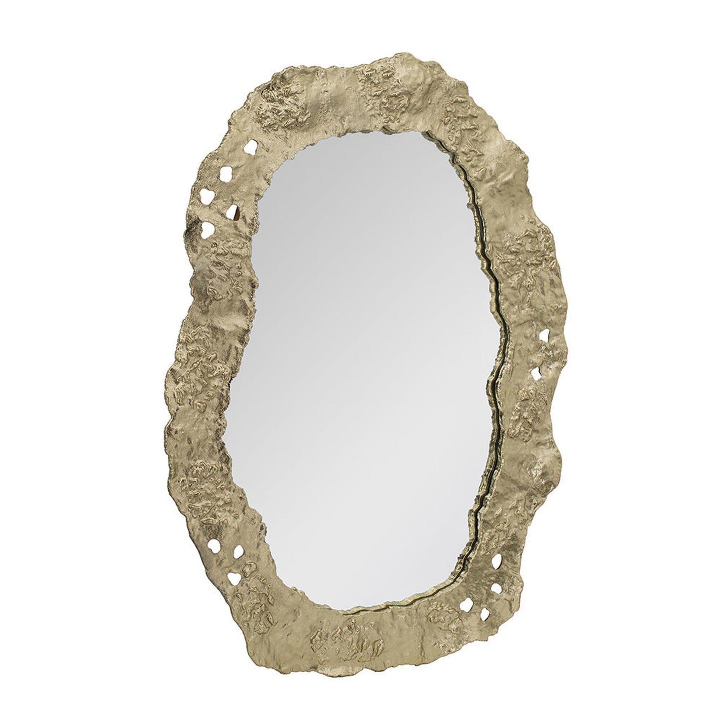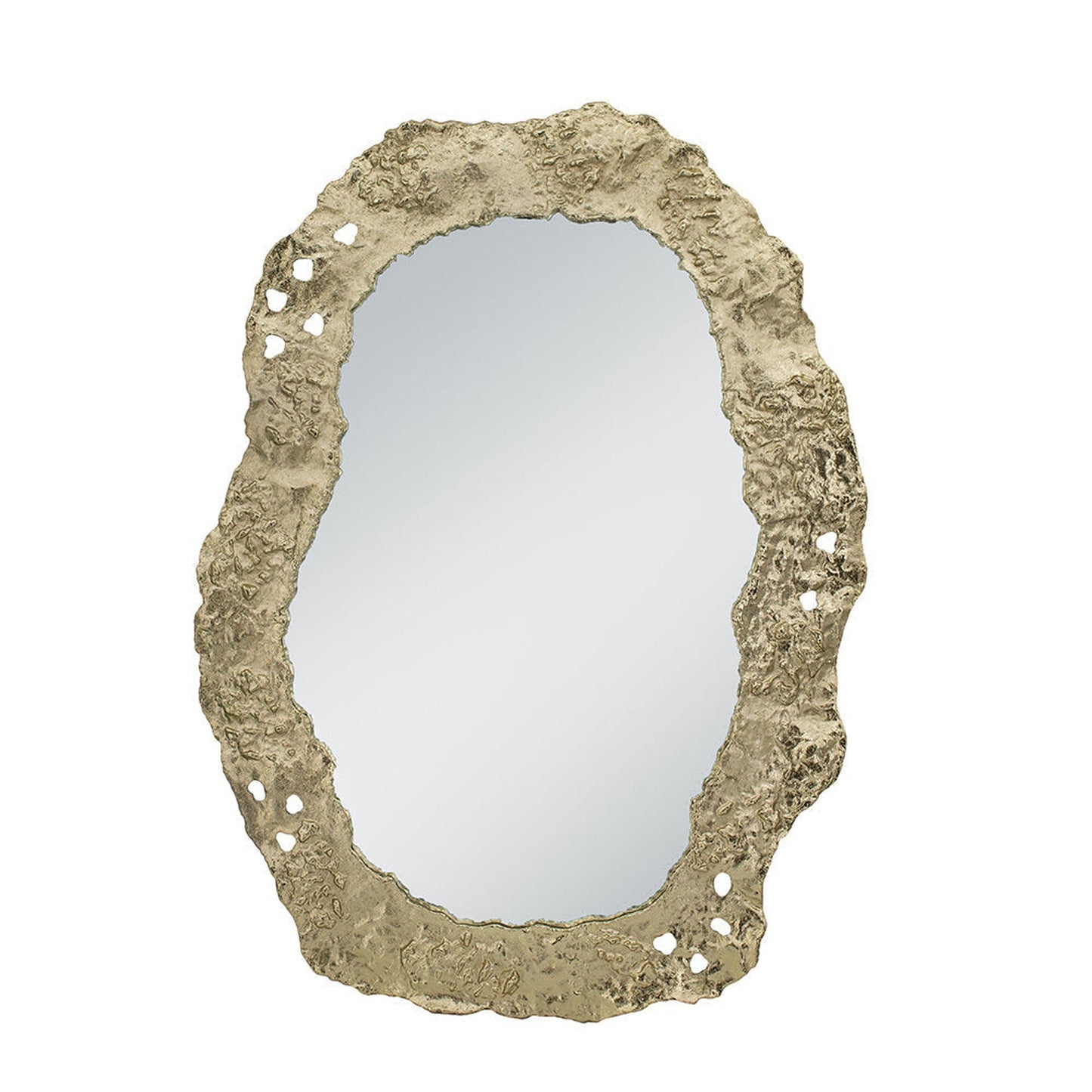 This wall mirror is made with a wavy antique brass finish frame for a cool contemporary flavor. Crafted with an irregular oval frame, this wall mirror uses its abstract style border to catch the eye and engage the viewer. A marvelous touch for bedrooms and hallways, it’s an understated twist that is perfectly suited for modern decor.