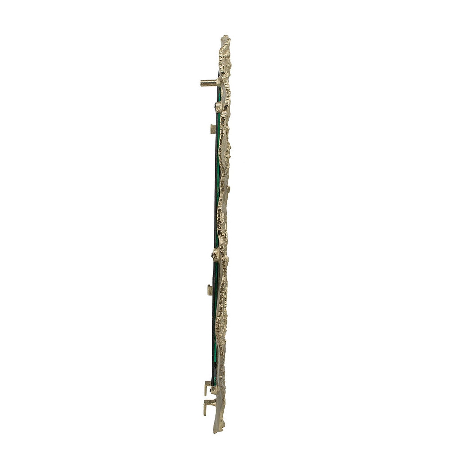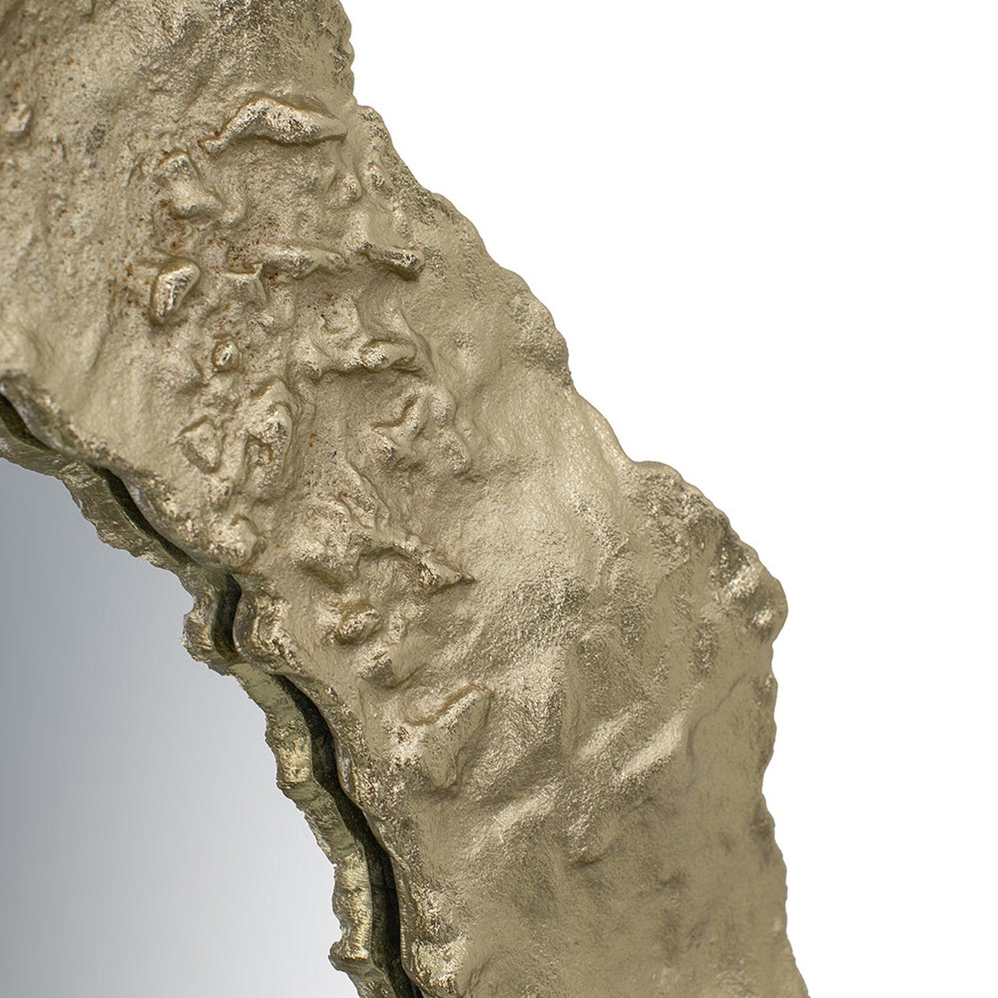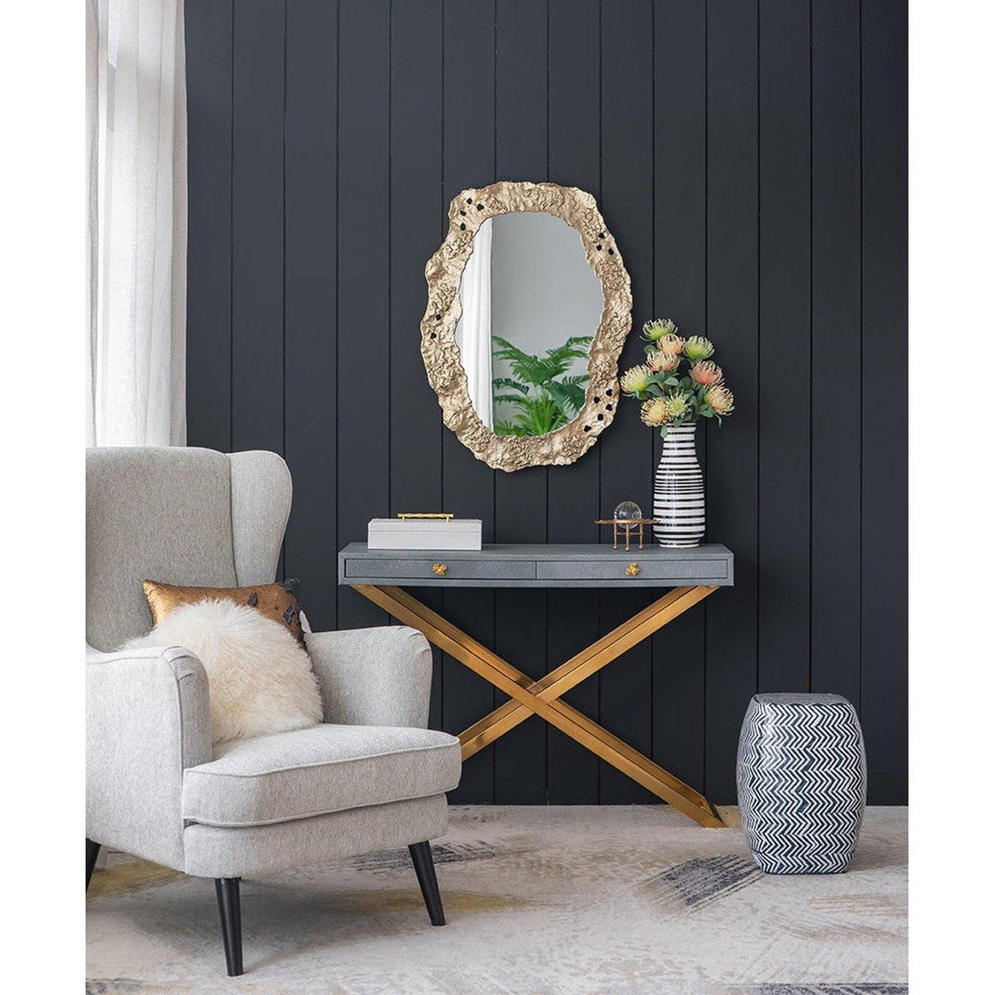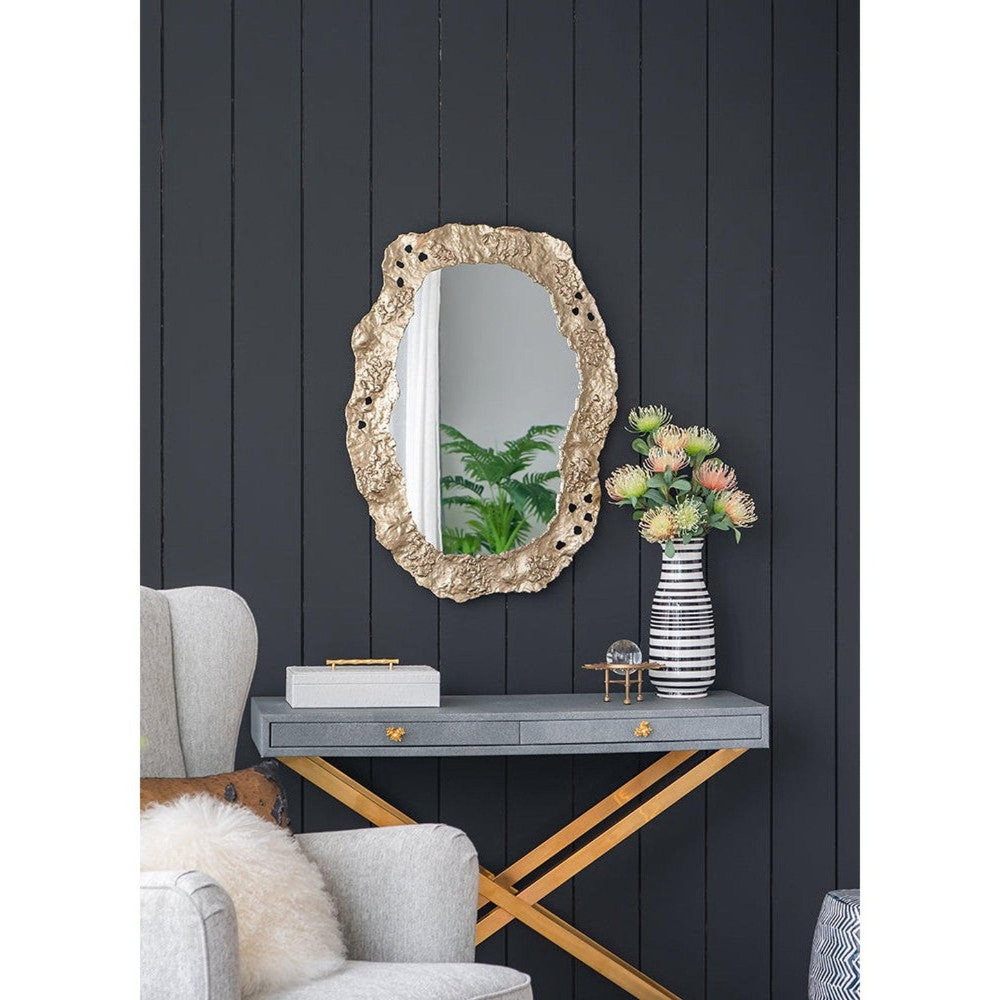 This wall mirror is made with a wavy antique brass finish frame for a cool contemporary flavor. Crafted with an irregular oval frame, this wall mirror uses its abstract style border to catch the eye and engage the viewer. A marvelous touch for bedrooms and hallways, it’s an understated twist that is perfectly suited for modern decor.