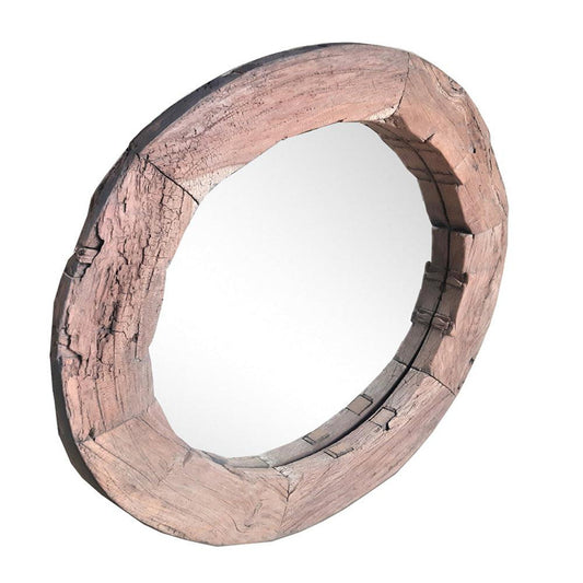 The Wagon Wheel Mirror adds rustic charm to any entry way or office. Framed in an original wood wheel, the mirror offers a natural grain and texture. Each mirror carries its own textures and variations through the use of the real reclaimed wheel. Styled in a wabi-sabi design, this Rustic Mirror is sure to be eye catching.