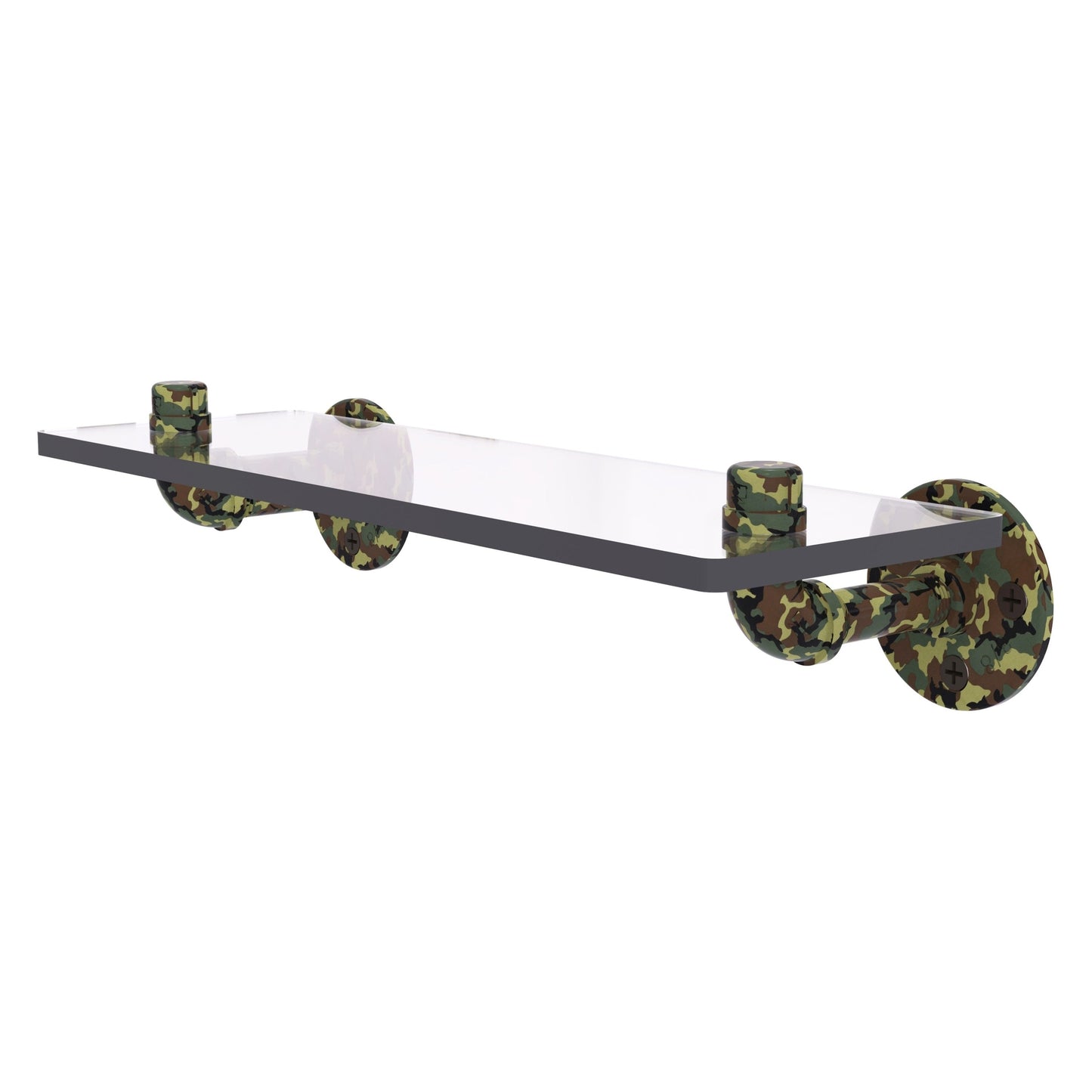 Bring in the outdoors with this unique camouflage Glass Shelf. We have created this unique product line for the outdoor enthusiast using our farmhouse style bathroom accessories. The camo pattern applied to this product is protected with lifetime materials to provide a decorative and clean finish. Glass shelf features thick 3/8 Inch beveled glass with polished edges for strength and safety. The choice of superior materials makes this item free from corrosion and rust. Glass Shelf mounts firmly with color coordinating screws and comes with a limited lifetime warranty.