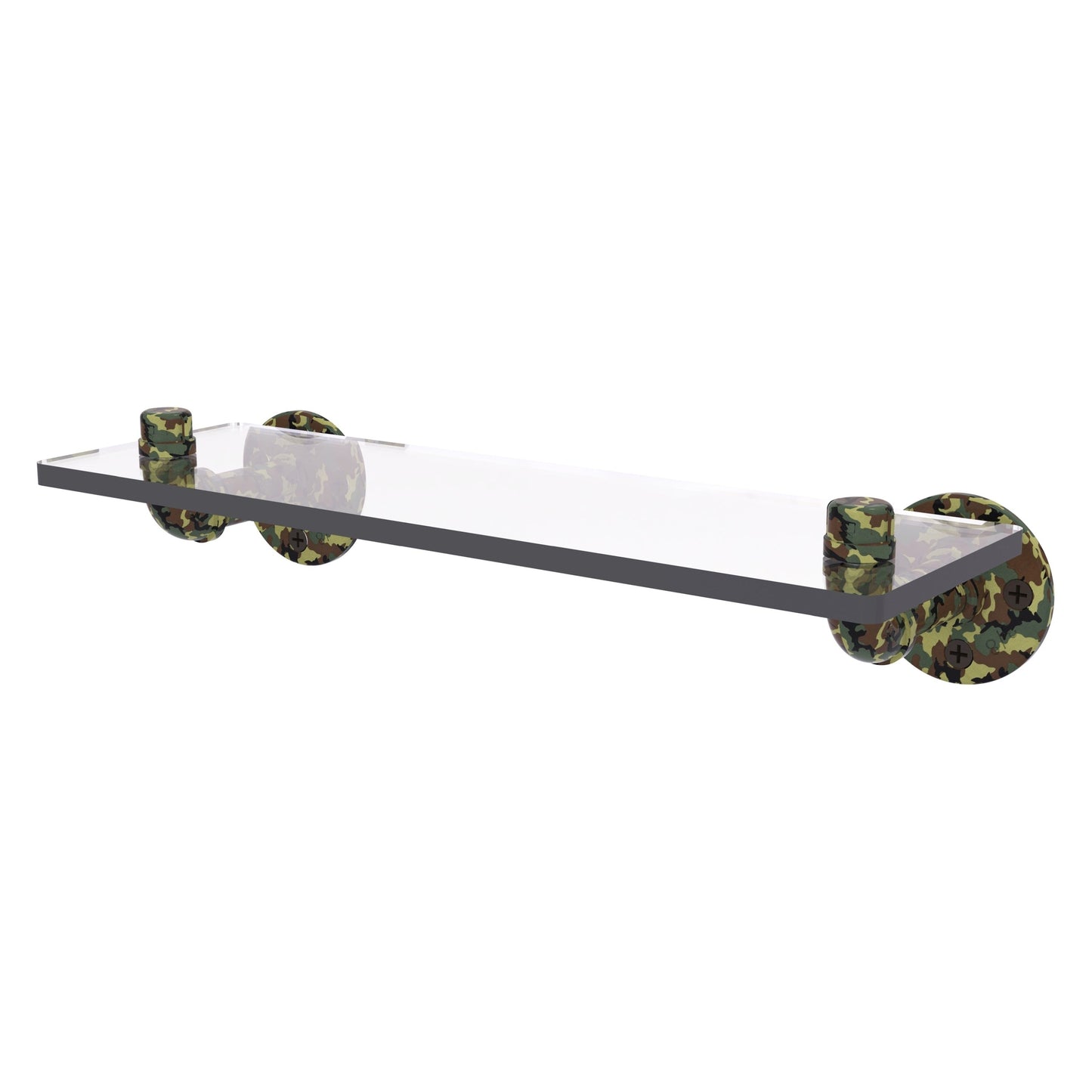 Bring in the outdoors with this unique camouflage Glass Shelf. We have created this unique product line for the outdoor enthusiast using our farmhouse style bathroom accessories. The camo pattern applied to this product is protected with lifetime materials to provide a decorative and clean finish. Glass shelf features thick 3/8 Inch beveled glass with polished edges for strength and safety. The choice of superior materials makes this item free from corrosion and rust. Glass Shelf mounts firmly with color coordinating screws and comes with a limited lifetime warranty.