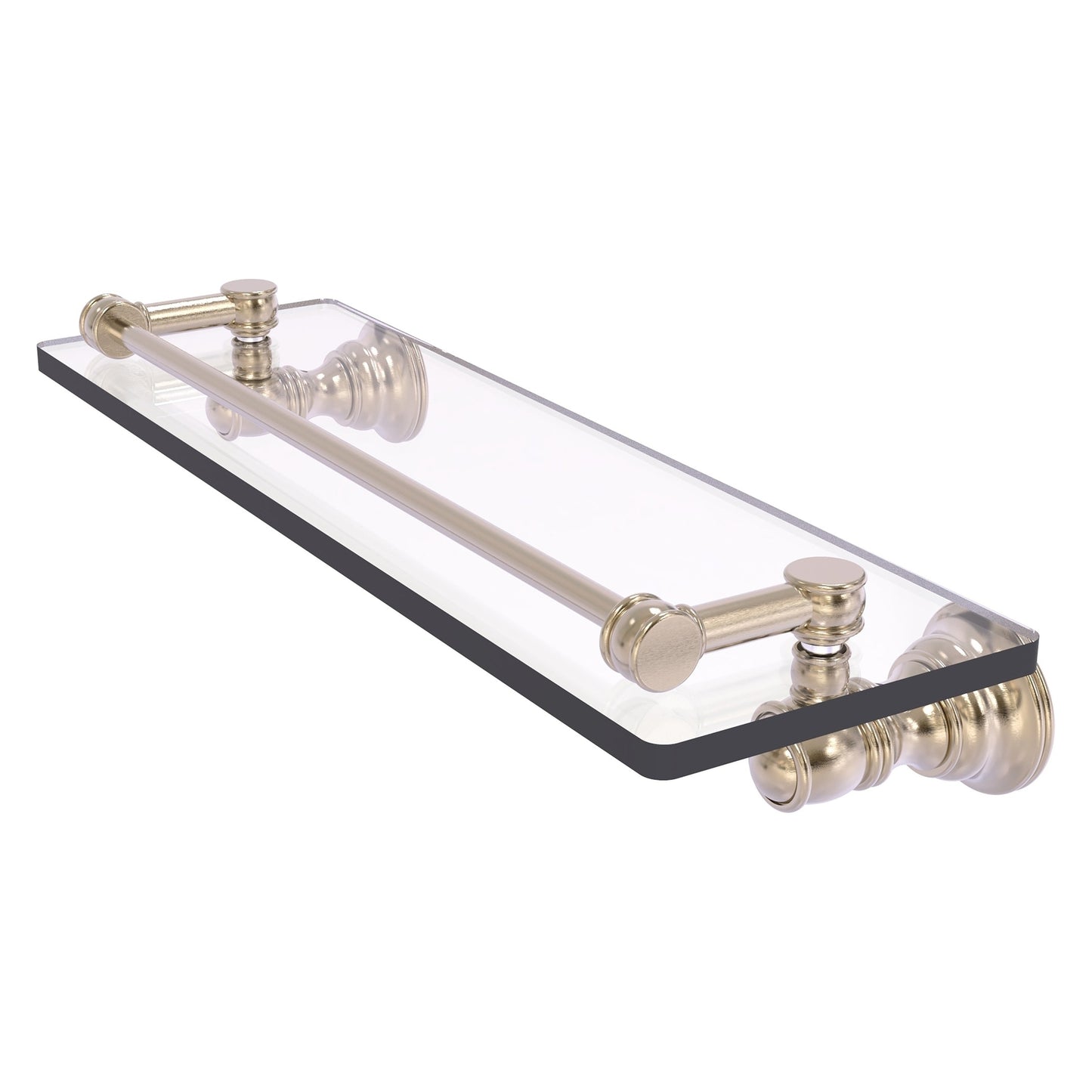 Reimagine your bathroom with this finely crafted gallery glass shelf. The gallery rail on the shelf is made of solid brass and will keep your items securely in place. Traditional style and superior quality resonate from this hand crafted accessory. Featuring thick, beveled-edge glass and solid brass hardware this shelf is crafted for durability strength and style. One of the many coordinating accessories in the Allied Brass Collection of accessories, this subtle gallery glass shelf is the perfect complement to your bathroom decor.