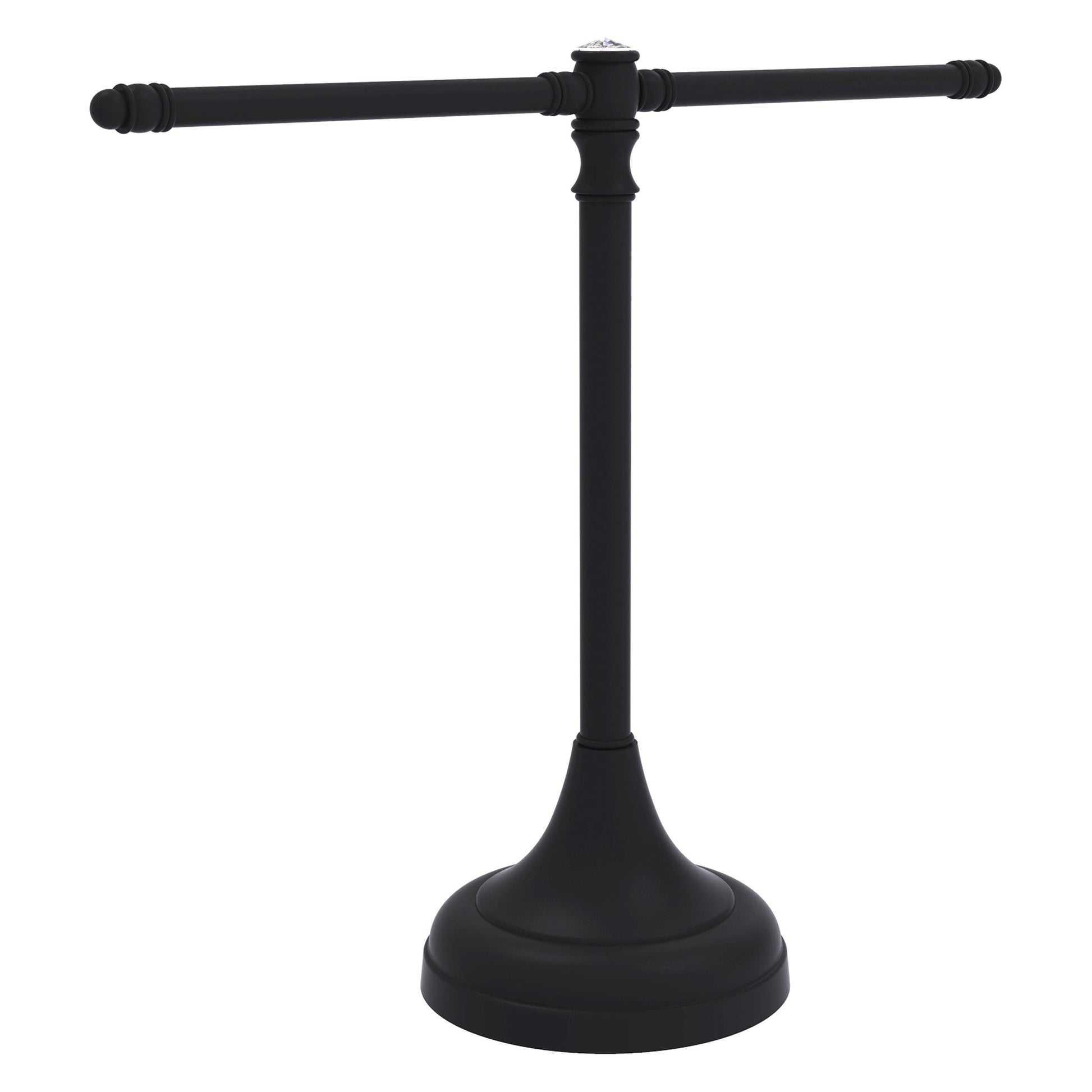 This elegantly crafted vanity top guest towel stand with crystal accents will add style and convenience to your bathroom decor. This guest towel stand with the added dazzle of crystal has two arms to keep your towels within reach of the sink where they are needed. Designed ideally for hand towels and washcloths, its heavy base will help prevent this stand from tipping and a felt pad on bottom will protect your countertop surface.