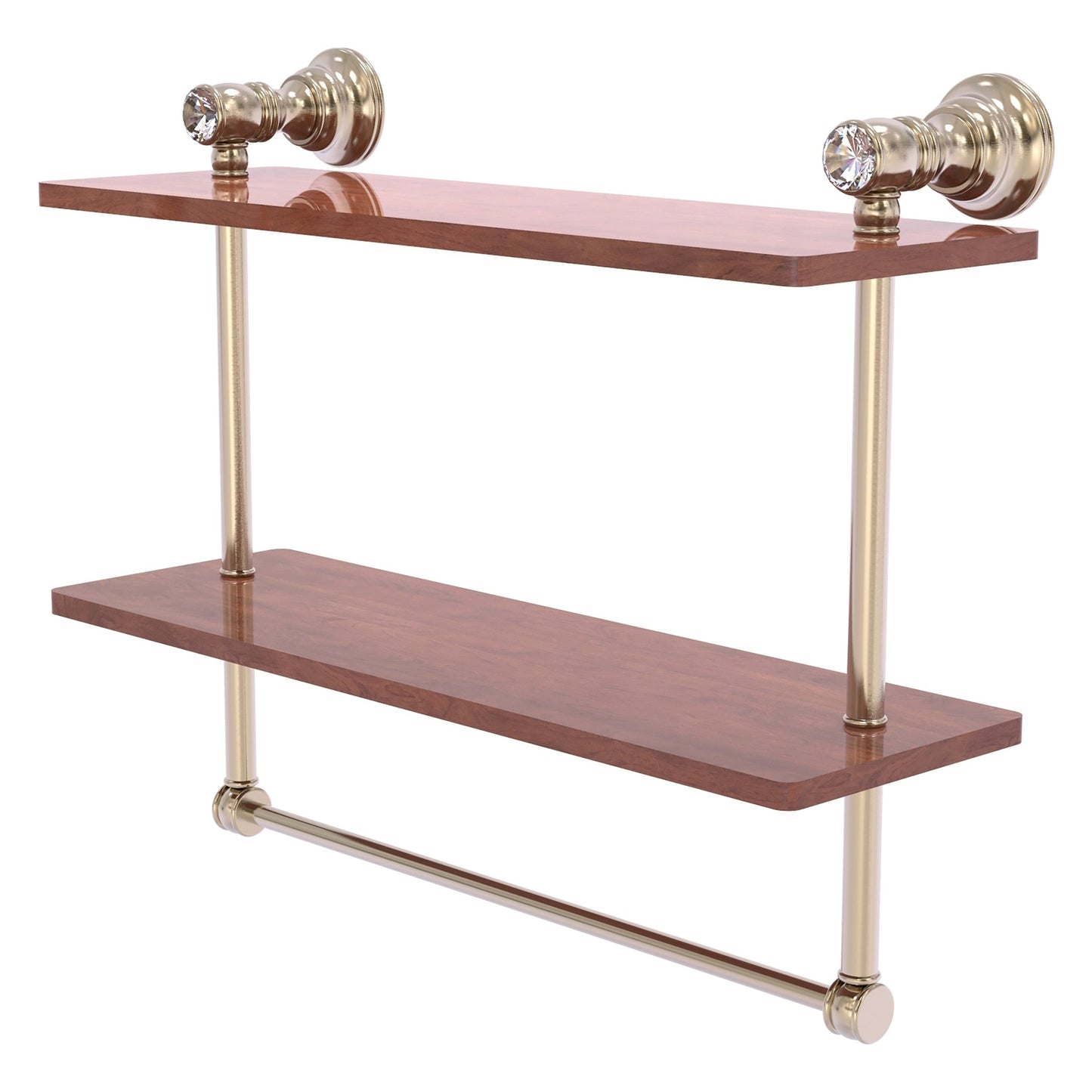 Reimagine your bathroom with this finely crafted double hardwood shelf with integrated towel bar and crystal accents. Solid brass integrated towel bar provides a creative space for your towels while the 2 shelves provide plenty of space for everything else. Traditional style and superior quality resonate from this hand crafted accessory. Featuring the finest hardwood and solid brass hardware this shelf is crafted for durability strength and style. One of the many coordinating accessories in the Allied Brass Collection of accessories, this double hardwood shelf and integrated towel bar with the added sparkle of crystal is the perfect complement to your bathroom decor.