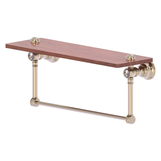 Reimagine your bathroom with this finely crafted hardwood shelf with integrated towel bar and crystal accents. Solid brass integrated towel bar provides a creative space for your towels. Traditional style and superior quality resonate from this hand crafted accessory. Featuring the finest hardwood and solid brass hardware this shelf is crafted for durability strength and style. One of the many coordinating accessories in the Allied Brass Collection of accessories, this decorative hardwood shelf and integrated towel bar with the added sparkle of crystal is the perfect complement to your bathroom decor.