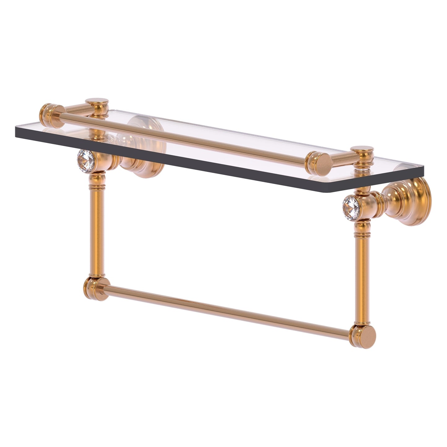 Reimagine your bathroom with this finely crafted gallery glass shelf with integrated towel bar and crystal accents. The gallery rail on the shelf is made of solid brass and will keep your items securely in place. Solid brass integrated towel bar provides a creative space for your towels. Traditional style and superior quality resonate from this hand crafted accessory. Featuring thick, beveled-edge glass and solid brass hardware this shelf is crafted for durability strength and style. One of the many coordinating accessories in the Allied Brass Collection of accessories, this decorative gallery glass shelf and integrated towel bar with the added sparkle of crystal is the perfect complement to your bathroom decor.