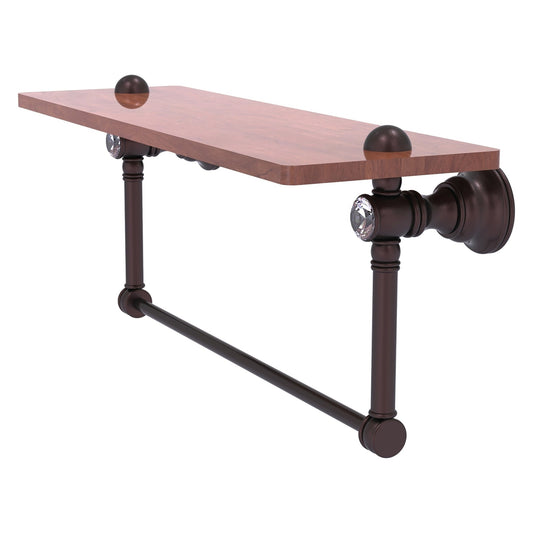 Reimagine your bathroom with this finely crafted hardwood shelf with integrated towel bar and crystal accents. Solid brass integrated towel bar provides a creative space for your towels. Traditional style and superior quality resonate from this hand crafted accessory. Featuring the finest hardwood and solid brass hardware this shelf is crafted for durability strength and style. One of the many coordinating accessories in the Allied Brass Collection of accessories, this decorative hardwood shelf and integrated towel bar with the added sparkle of crystal is the perfect complement to your bathroom decor.