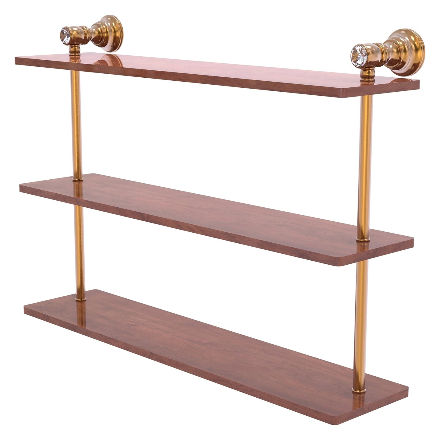 Reimagine your bathroom with this finely crafted triple hardwood shelf with crystal accents. Traditional styling and superior quality resonate from this handcrafted hardwood shelf. The 3 tiers of this shelf make great use of your wall space while providing plenty of room for storage. Featuring the finest hardwood and solid brass hardware this shelf with the dazzle of crystal is crafted for durability, strength and style.