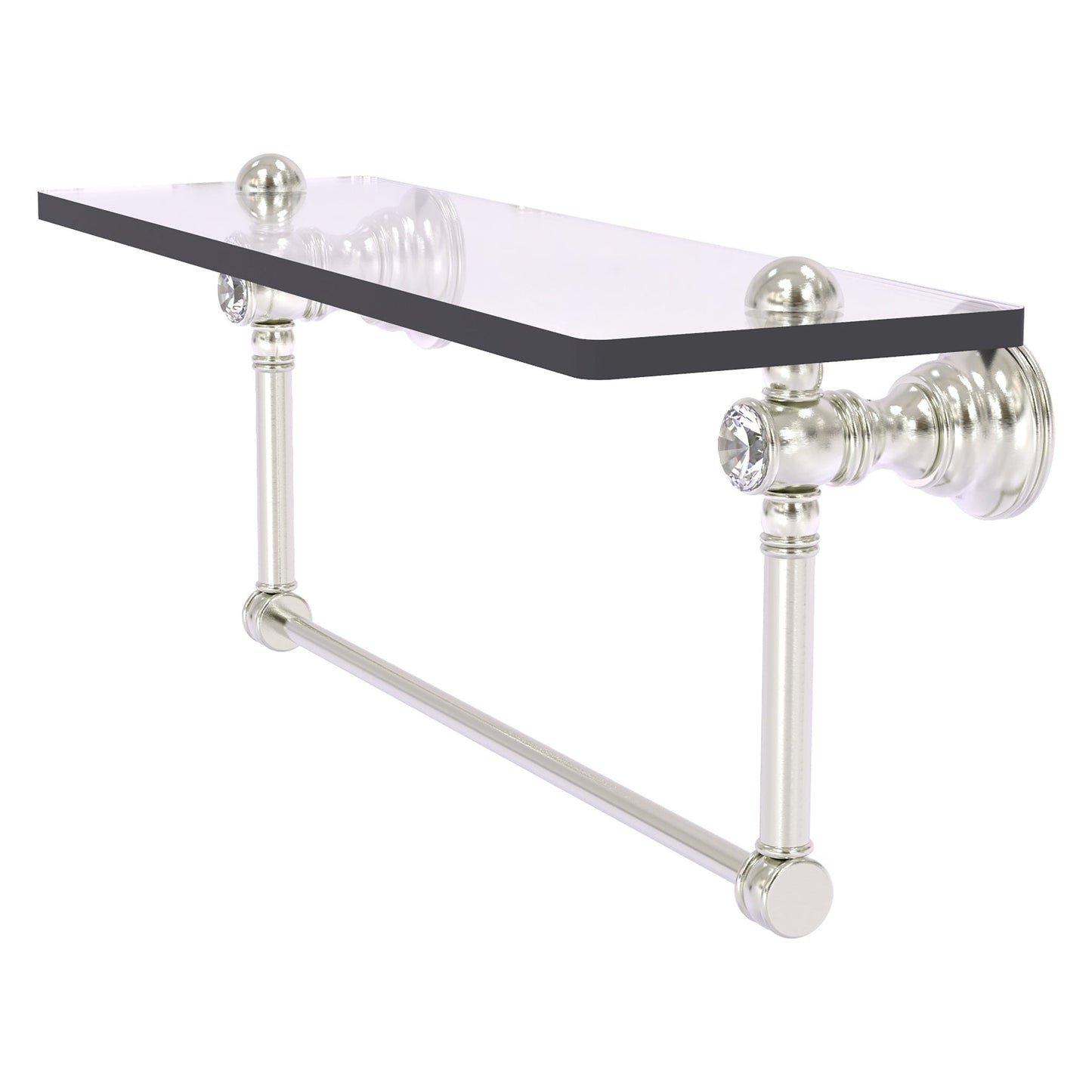 Reimagine your bathroom with this finely crafted glass shelf with integrated towel bar and crystal accents. Solid brass integrated towel bar provides a creative space for your towels. Traditional style and superior quality resonate from this hand crafted accessory. Featuring thick, beveled-edge glass and solid brass hardware this shelf is crafted for durability strength and style. One of the many coordinating accessories in the Allied Brass Collection of accessories, this decorative glass shelf and integrated towel bar with the gleam of crystal is the perfect complement to your bathroom decor.