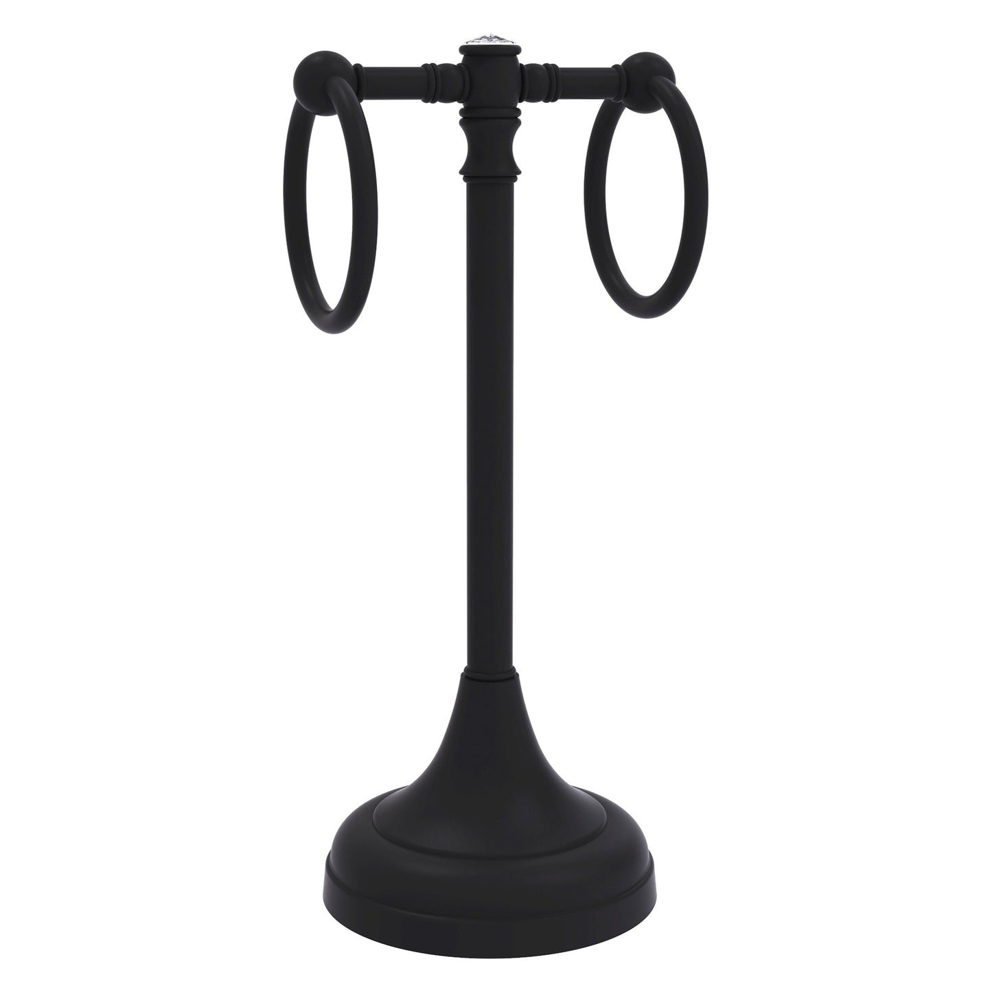 Add an interesting design element to your bathroom with this free standing guest towel stand with crystal accents. It has hanging rings to hold two hand towels conveniently next to the sink. Its classic traditional style will complement your decor and with a weight in the base it will stay stable on the countertop.