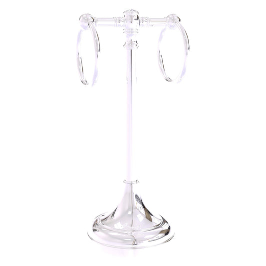 Add an interesting design element to your bathroom with this free standing guest towel stand with crystal accents. It has hanging rings to hold two hand towels conveniently next to the sink. Its classic traditional style will complement your decor and with a weight in the base it will stay stable on the countertop.
