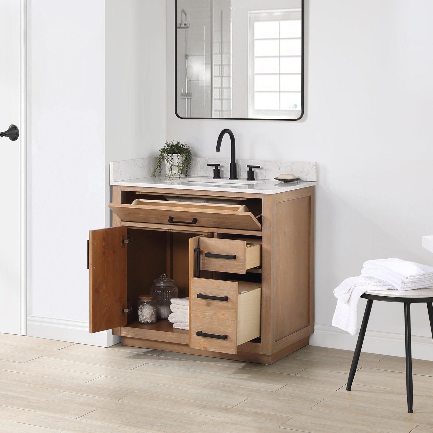 - Drawer & Door: 2 soft-closing doors,1 flip-down drawer,1 soft-closing drawer and 1 two-in-one functional drawer to maximize your bathroom storage space.