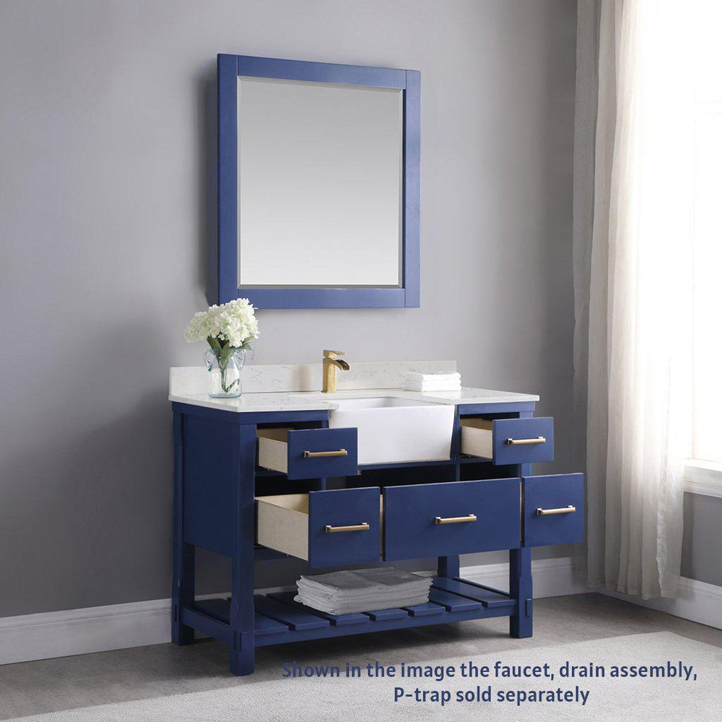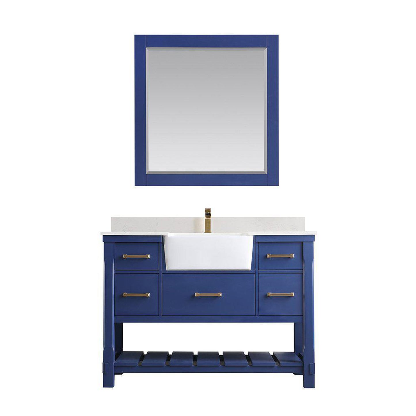 Altair Georgia 48" Single Jewelry Blue Freestanding Bathroom Vanity Set With Mirror, Aosta White Composite Stone Top, Rectangular Farmhouse Sink, Overflow, and Backsplash