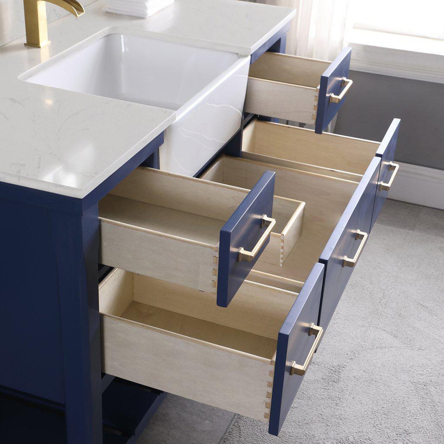 Looking for a showstopper piece of furniture to make your bathroom truly breathtaking? The Georgia Vanity is it. Featuring a classic apron-style sink, Aosta White Composite Stone countertop and backsplash which included with a farmhouse- style ceramic under-mount sink, this piece lends affordable style to any guest or master bath. It has an open bay at the bottom that’s perfect for fluffy spa towels, toiletries or decorative items.