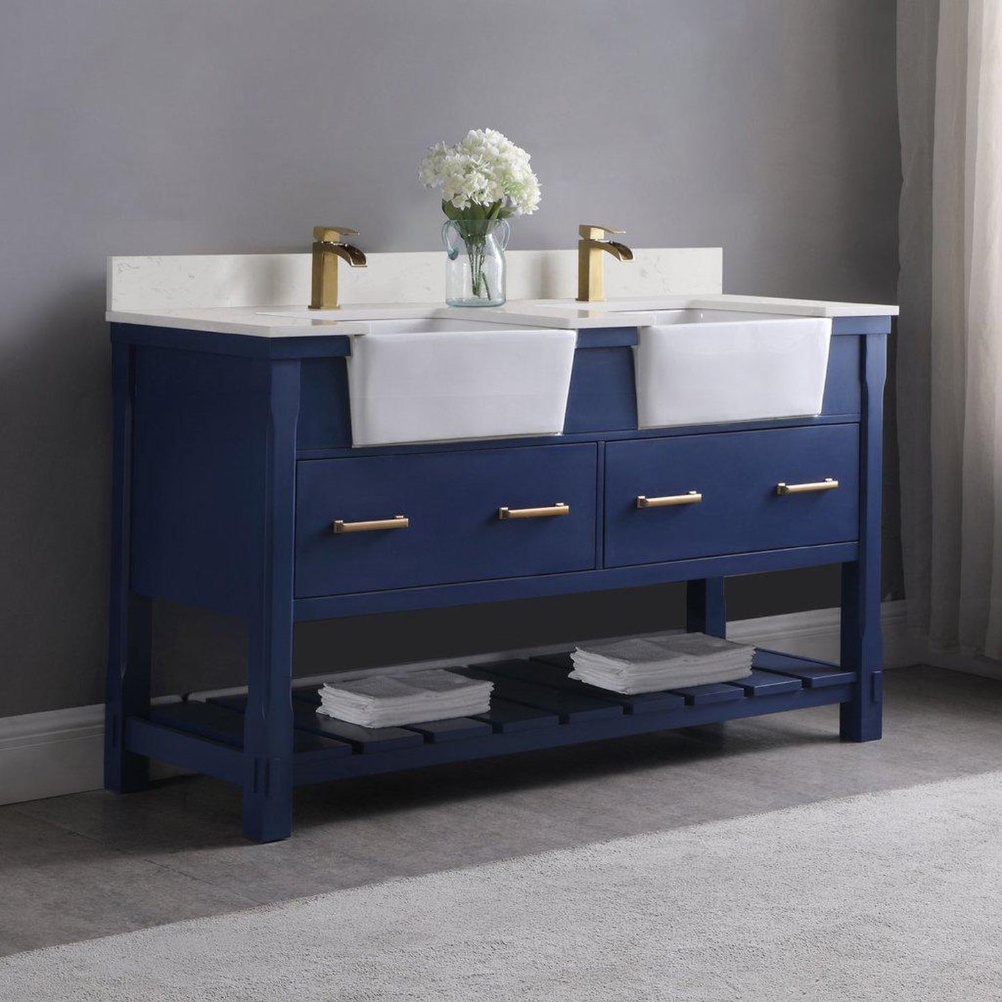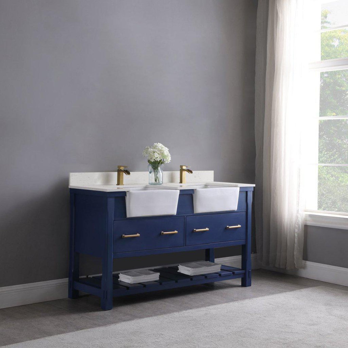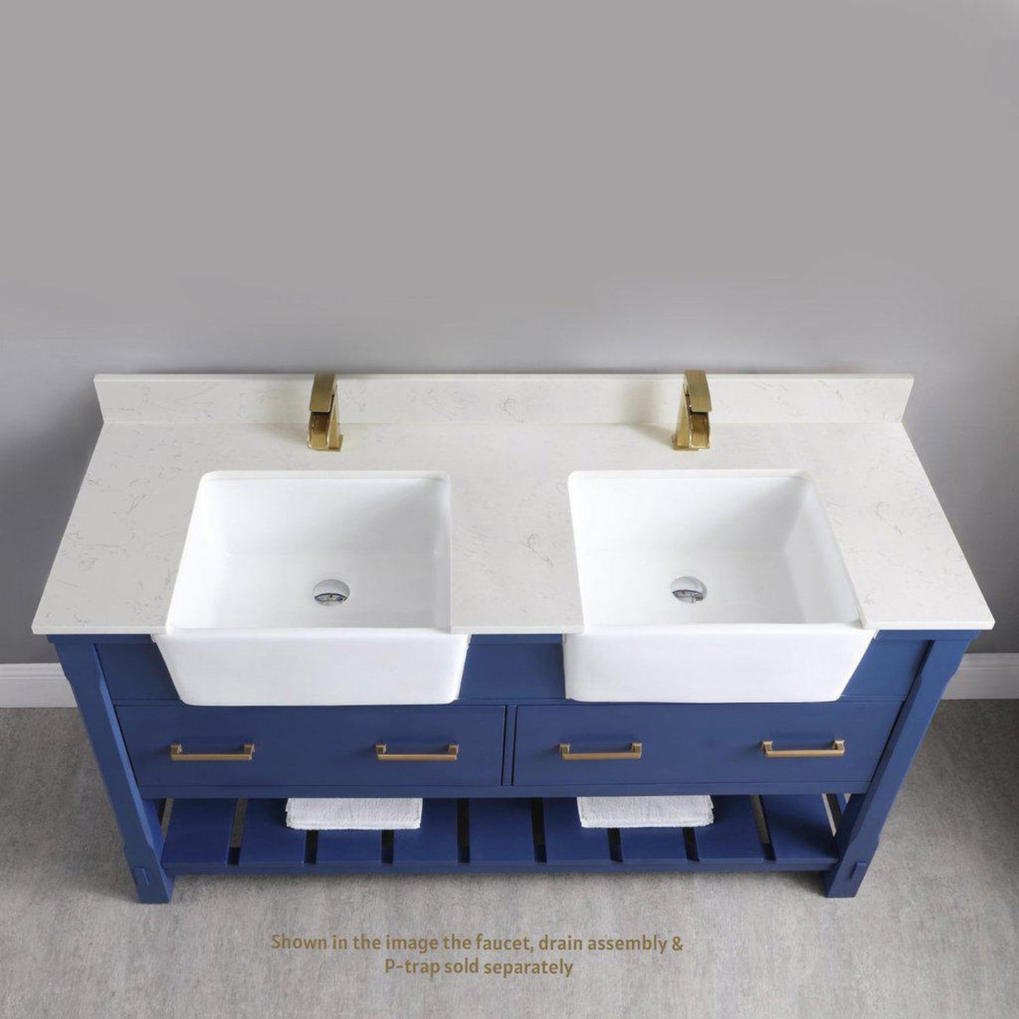 Altair Georgia 60" Double Jewelry Blue Freestanding Bathroom Vanity Set With Aosta White Composite Stone Top, Two Rectangular Farmhouse Sinks, Overflow, and Backsplash