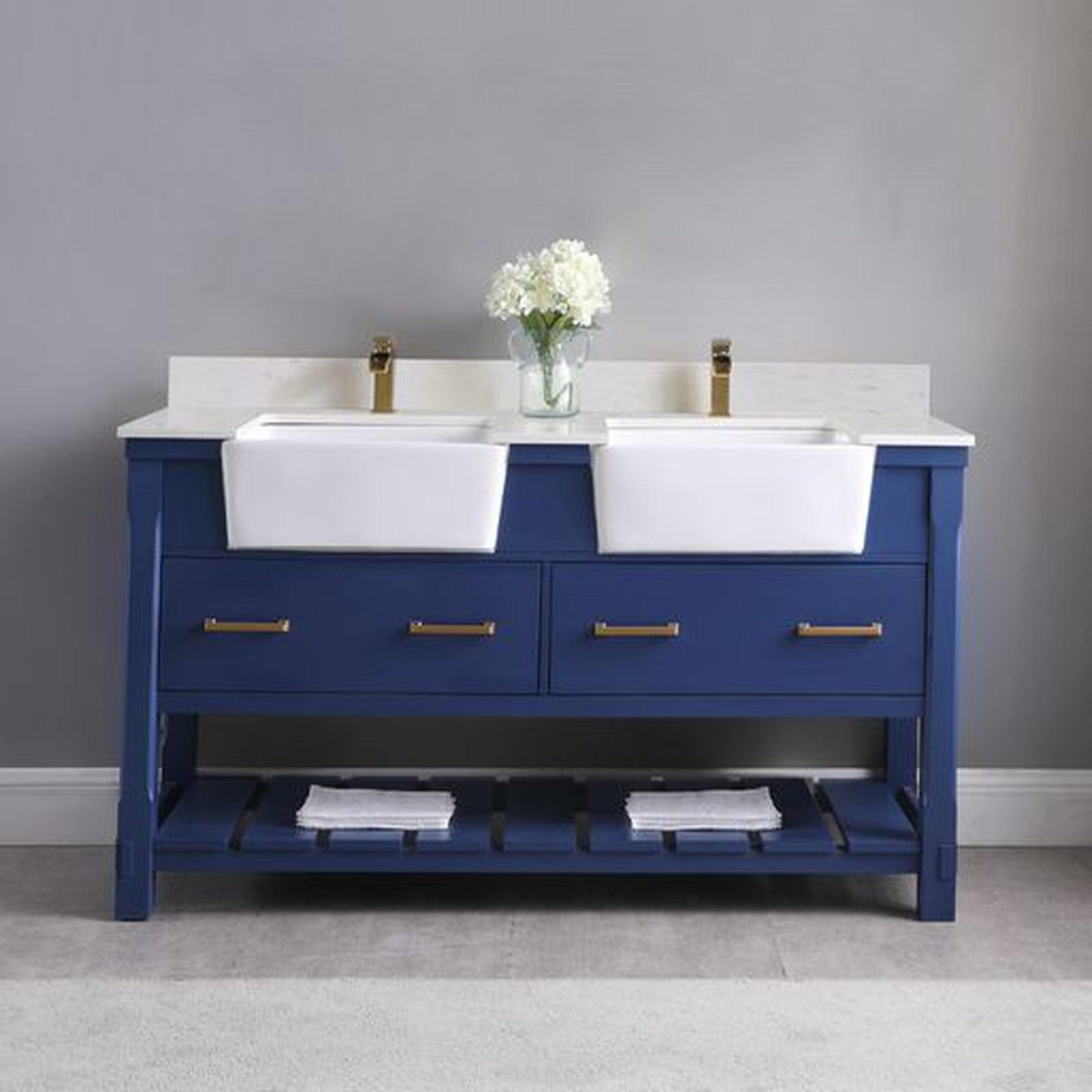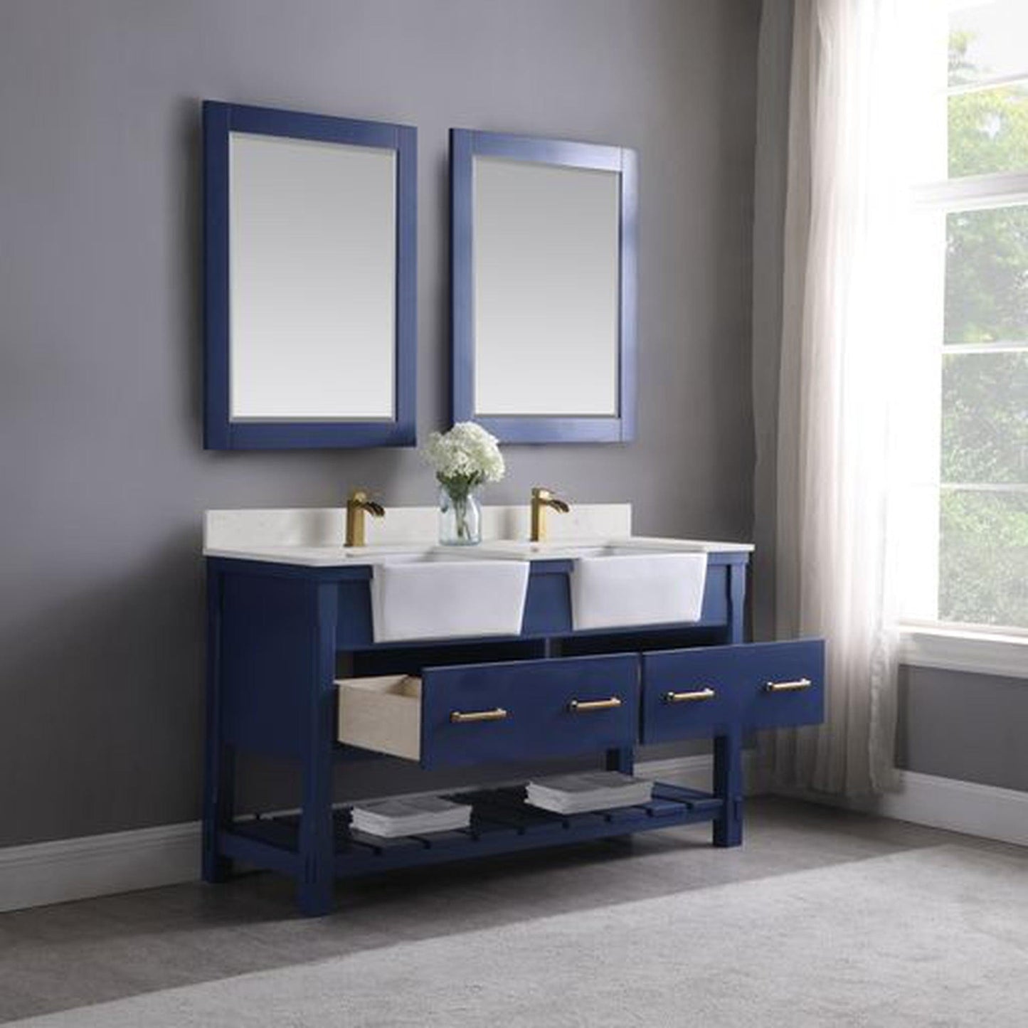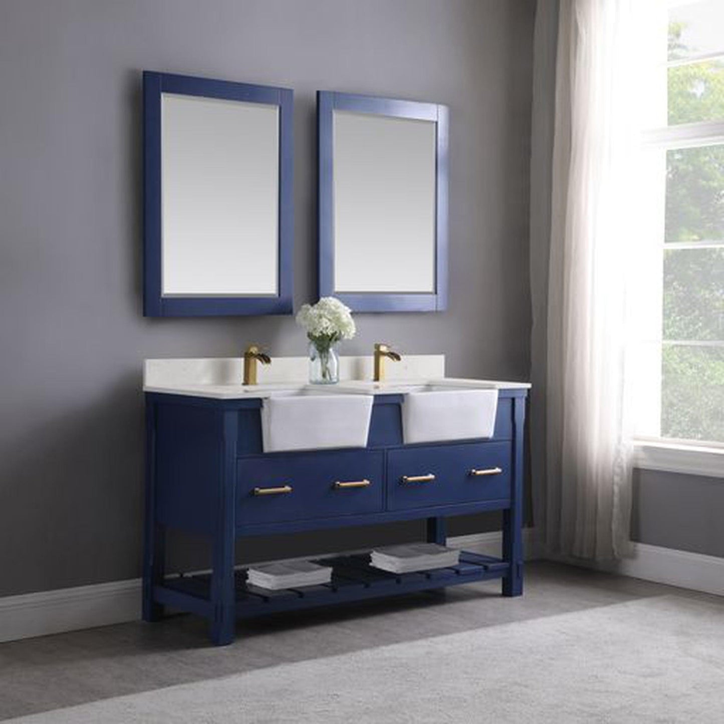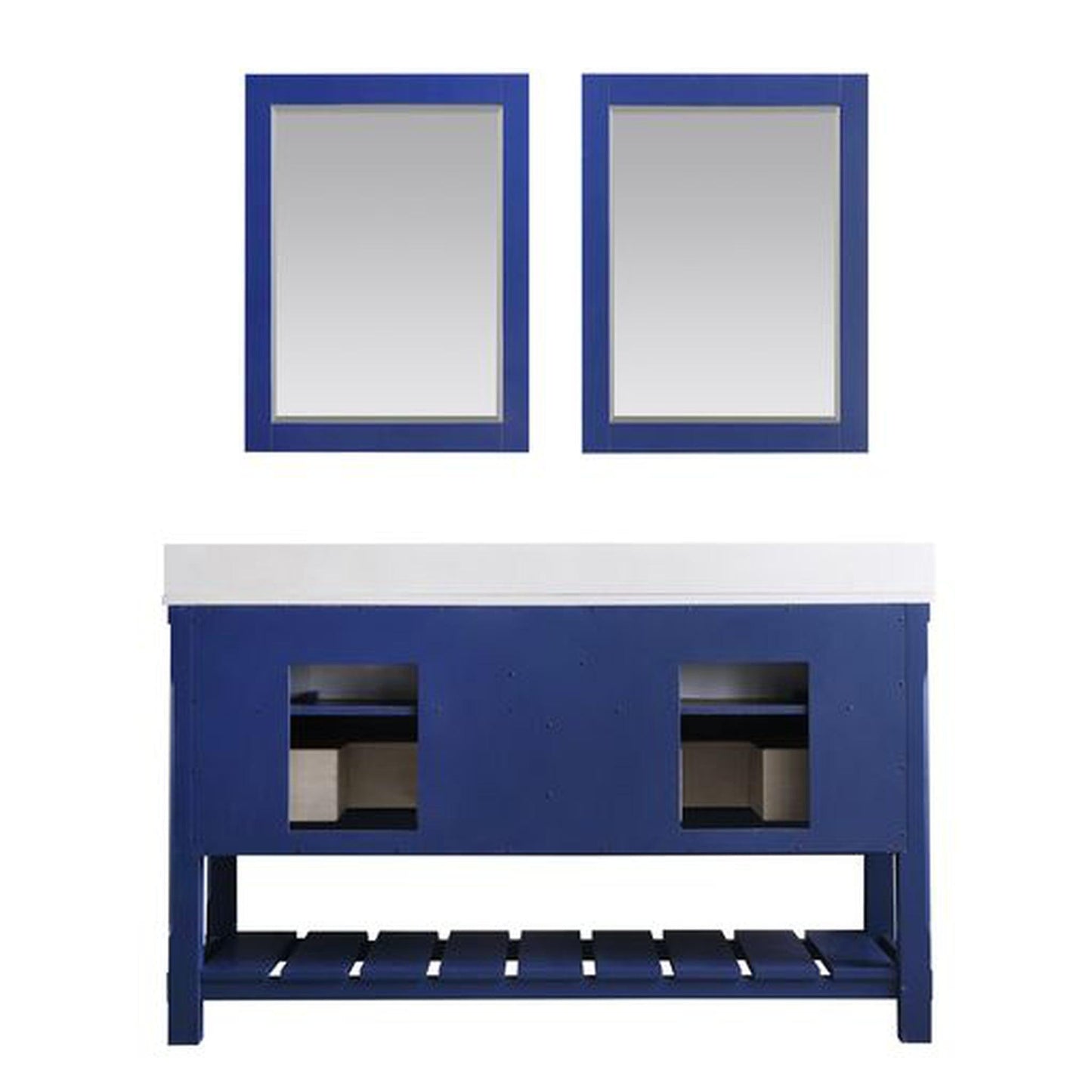 Altair Georgia 60" Double Jewelry Blue Freestanding Bathroom Vanity Set With Mirror, Aosta White Composite Stone Top, Two Rectangular Farmhouse Sinks, Overflow, and Backsplash