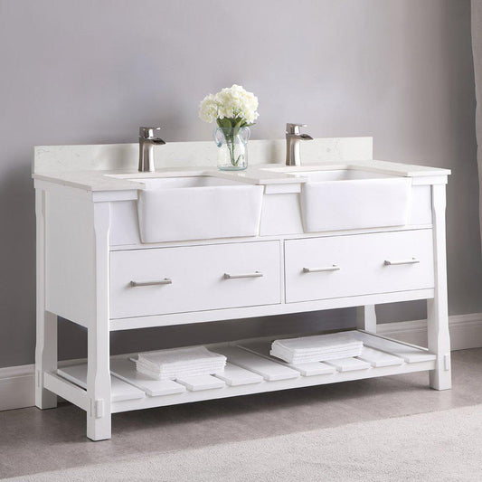 Altair Georgia 60" Double White Freestanding Bathroom Vanity Set With Mirror, Aosta White Composite Stone Top, Two Rectangular Farmhouse Sinks, Overflow, and Backsplash
