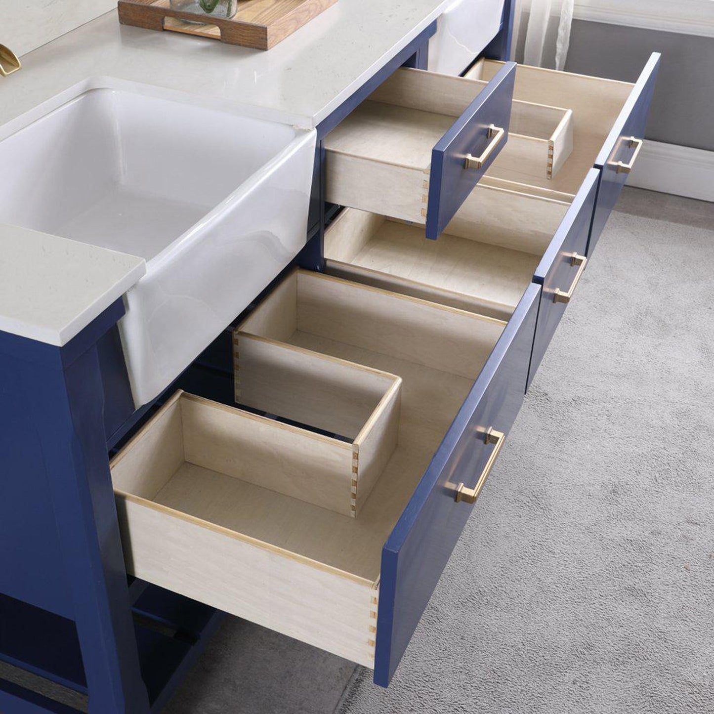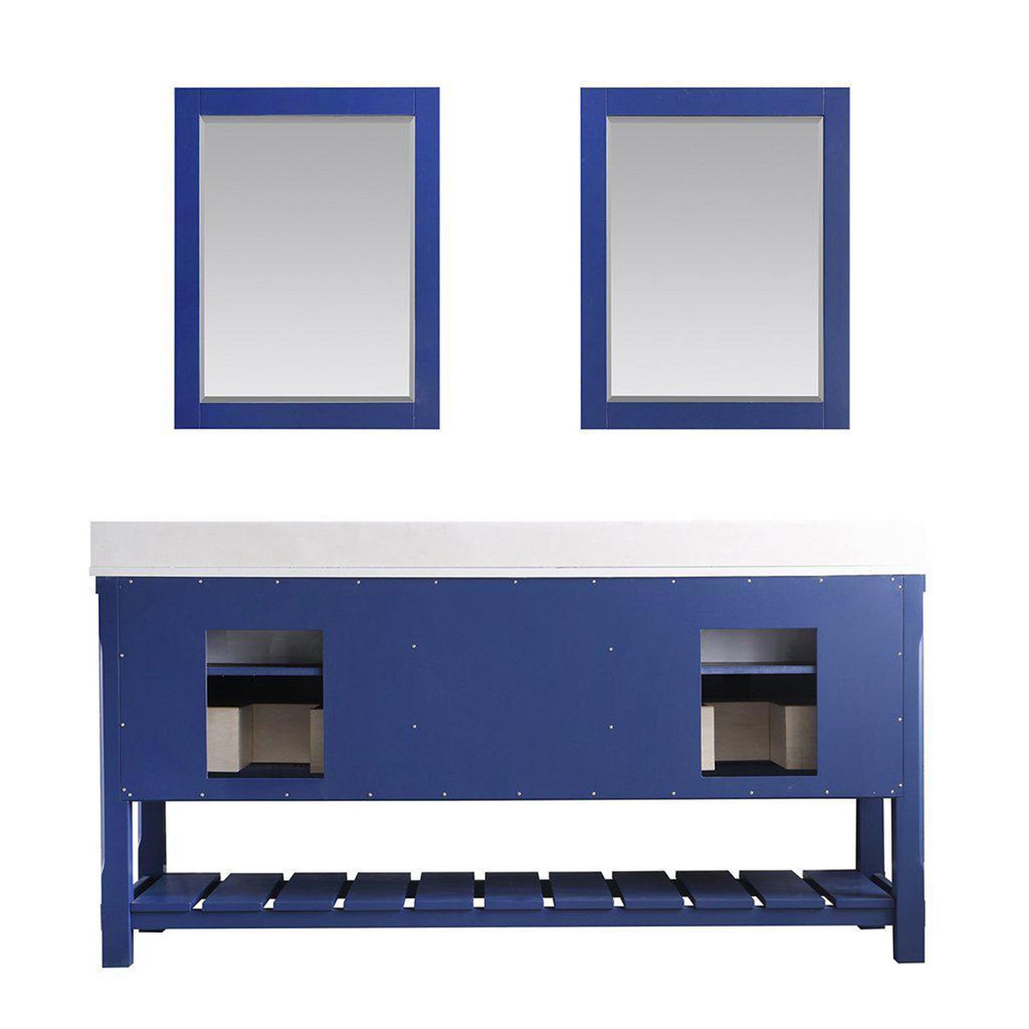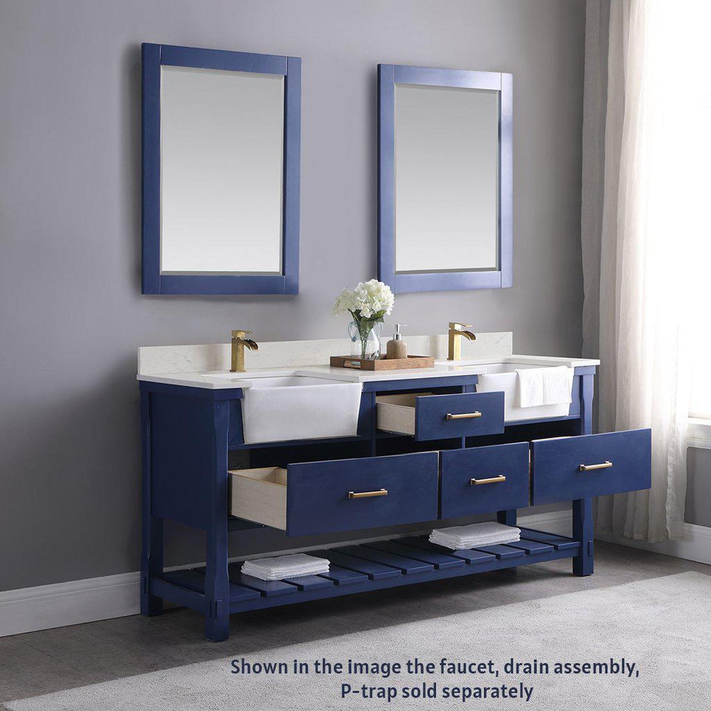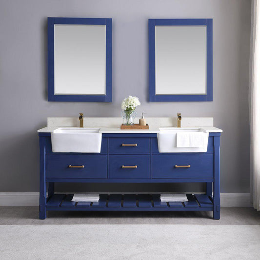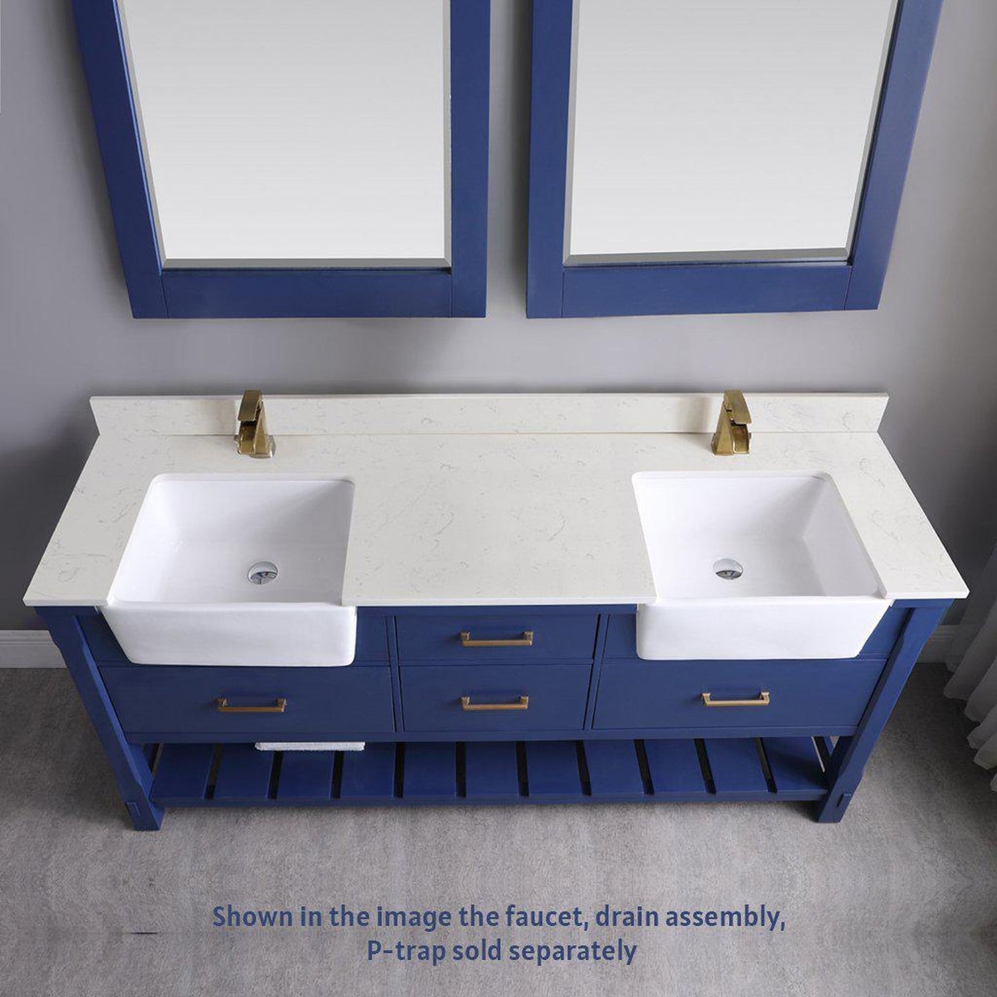 Altair Georgia 72" Double Jewelry Blue Freestanding Bathroom Vanity Set With Mirror, Aosta White Composite Stone Top, Two Rectangular Farmhouse Sinks, Overflow, and Backsplash