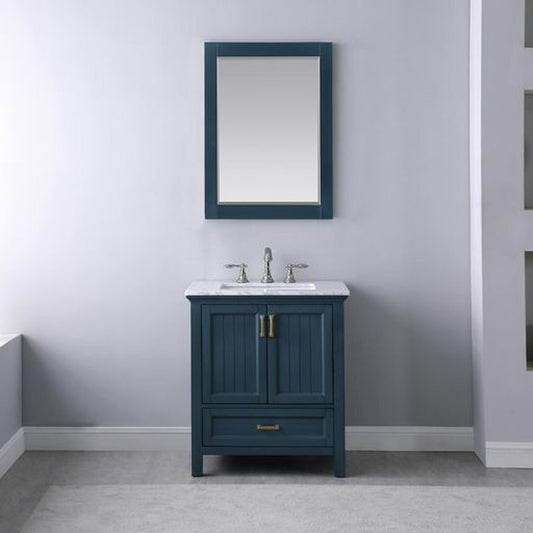 Altair Isla 30" Single Classic Blue Freestanding Bathroom Vanity Set With Mirror, Natural Carrara White Marble Top, Rectangular Undermount Ceramic Sink, and Overflow