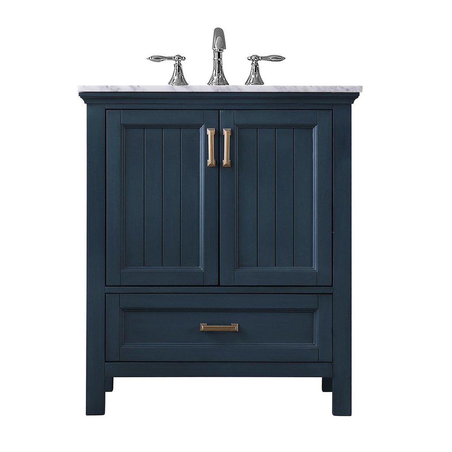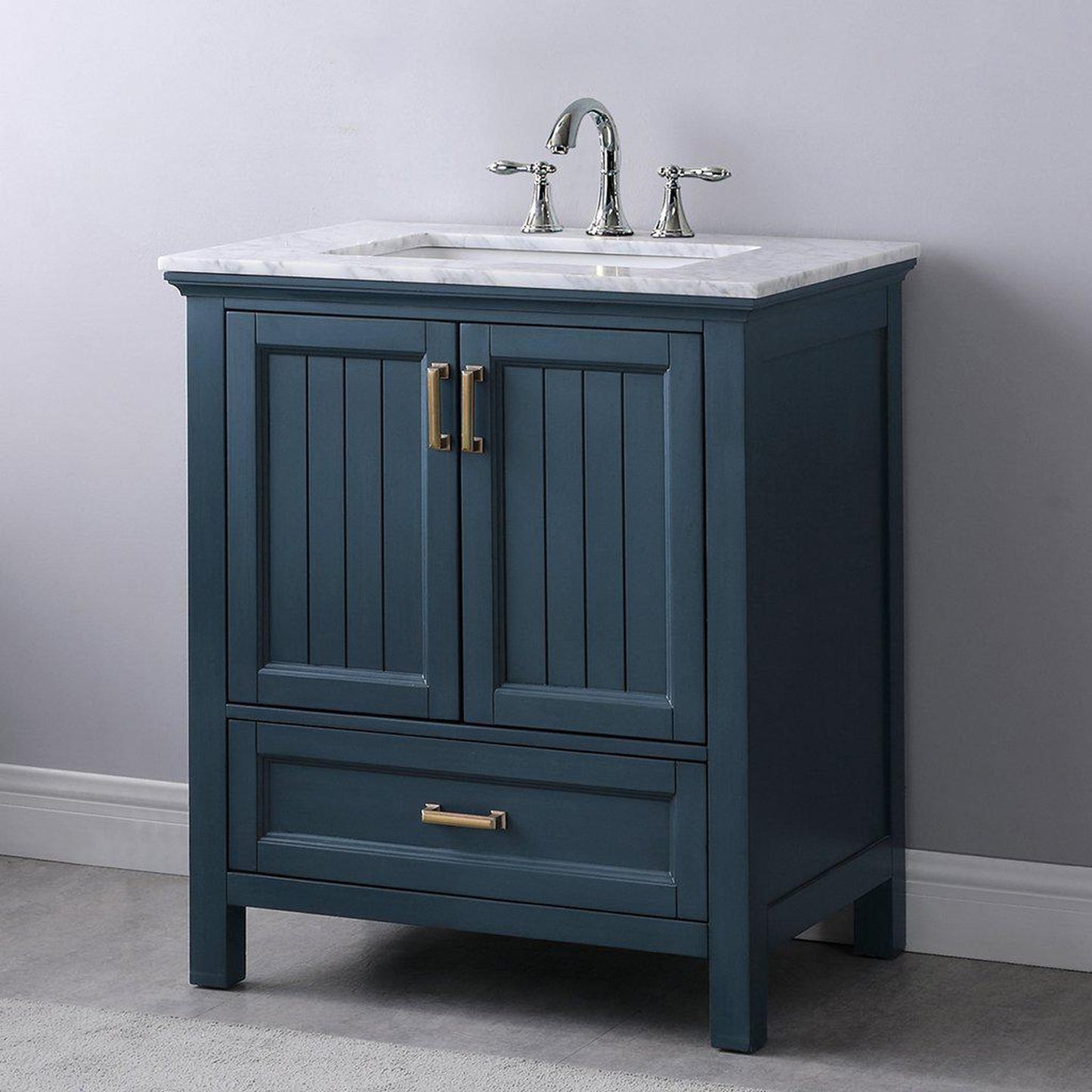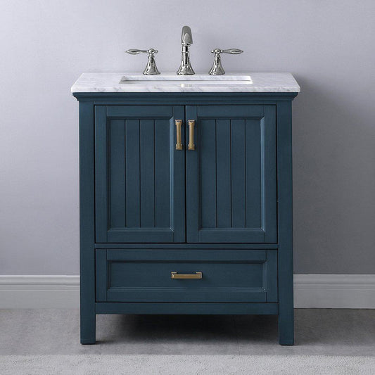 Altair Isla 30" Single Classic Blue Freestanding Bathroom Vanity Set With Natural Carrara White Marble Top, Rectangular Undermount Ceramic Sink, and Overflow