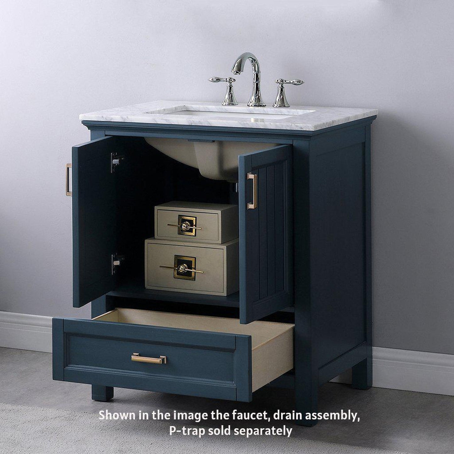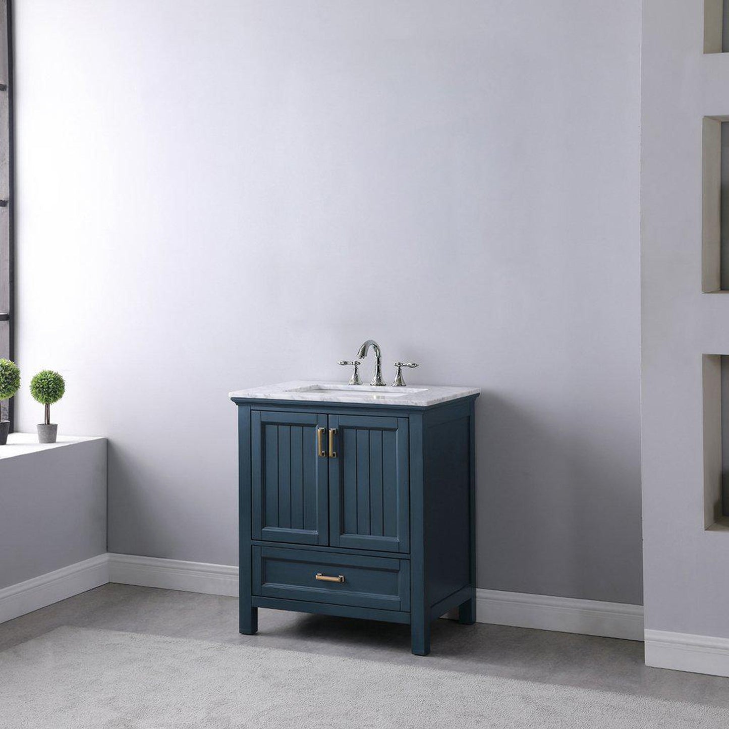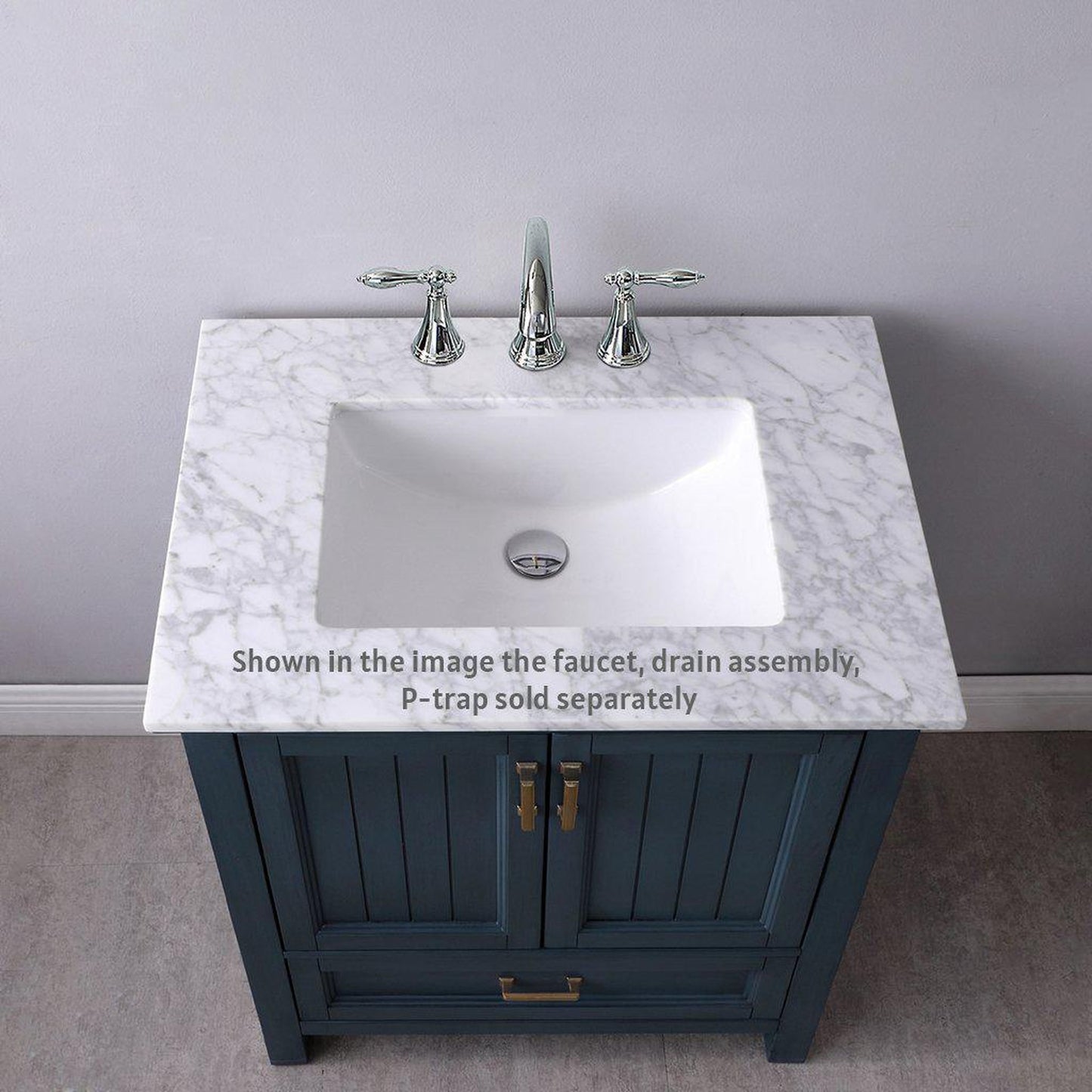 Altair Isla 30" Single Classic Blue Freestanding Bathroom Vanity Set With Natural Carrara White Marble Top, Rectangular Undermount Ceramic Sink, and Overflow
