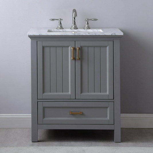 Altair Isla 30" Single Gray Freestanding Bathroom Vanity Set With Natural Carrara White Marble Top, Rectangular Undermount Ceramic Sink, and Overflow