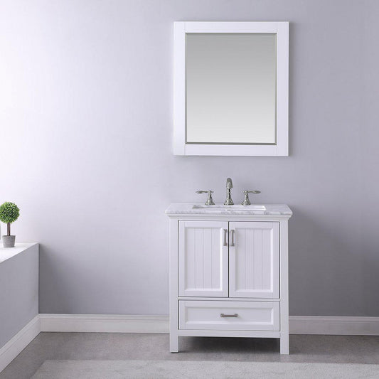 Altair Isla 30" Single White Freestanding Bathroom Vanity Set With Mirror, Natural Carrara White Marble Top, Rectangular Undermount Ceramic Sink, and Overflow