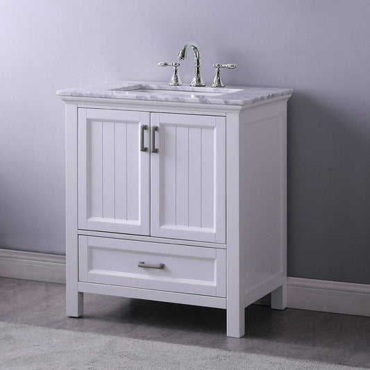 Altair Isla 30" Single White Freestanding Bathroom Vanity Set With Natural Carrara White Marble Top, Rectangular Undermount Ceramic Sink, and Overflow