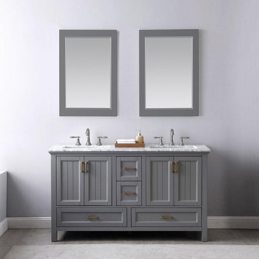 Altair Isla 60" Double Gray Freestanding Bathroom Vanity Set With Mirror, Natural Carrara White Marble Top, Two Rectangular Undermount Ceramic Sinks, and Overflow