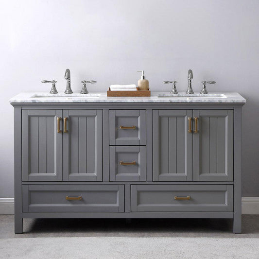 Altair Isla 60" Double Gray Freestanding Bathroom Vanity Set With Natural Carrara White Marble Top, Two Rectangular Undermount Ceramic Sinks, and Overflow