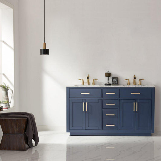 Altair Ivy 60" Double Royal Blue Freestanding Bathroom Vanity Set With Natural Carrara White Marble Top, Two Rectangular Undermount Ceramic Sinks, and Overflow