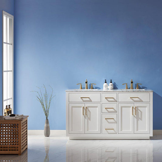 Altair Ivy 60" Double White Freestanding Bathroom Vanity Set With Natural Carrara White Marble Top, Two Rectangular Undermount Ceramic Sinks, and Overflow
