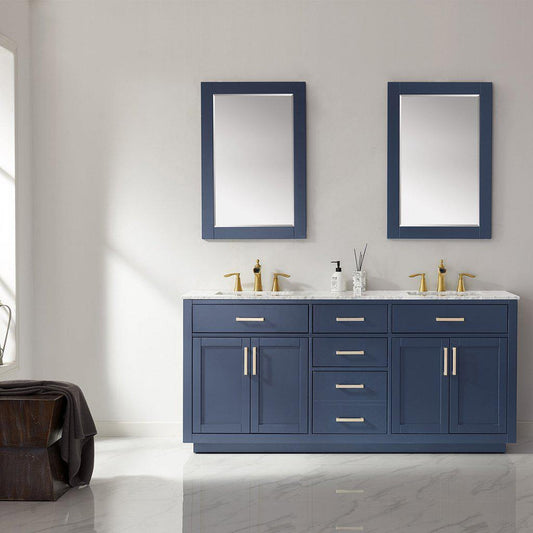 Altair Ivy 72" Double Royal Blue Freestanding Bathroom Vanity Set With Mirror, Natural Carrara White Marble Top, Two Rectangular Undermount Ceramic Sinks, and Overflow