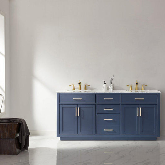 Altair Ivy 72" Double Royal Blue Freestanding Bathroom Vanity Set With Natural Carrara White Marble Top, Two Rectangular Undermount Ceramic Sinks, and Overflow