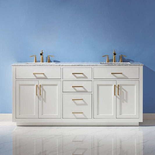 Altair Ivy 72" Double White Freestanding Bathroom Vanity Set With Natural Carrara White Marble Top, Two Rectangular Undermount Ceramic Sinks, and Overflow
