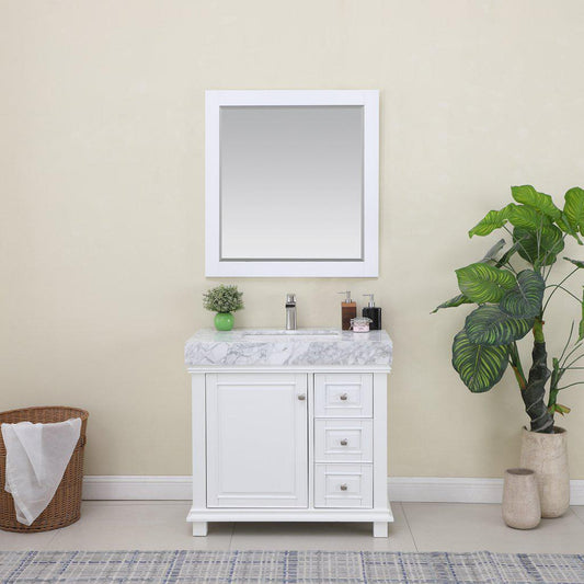 Altair Jardin 36" Single White Freestanding Bathroom Vanity Set With Mirror, Natural Carrara White Marble Top, Rectangular Undermount Ceramic Sink, and Overflow