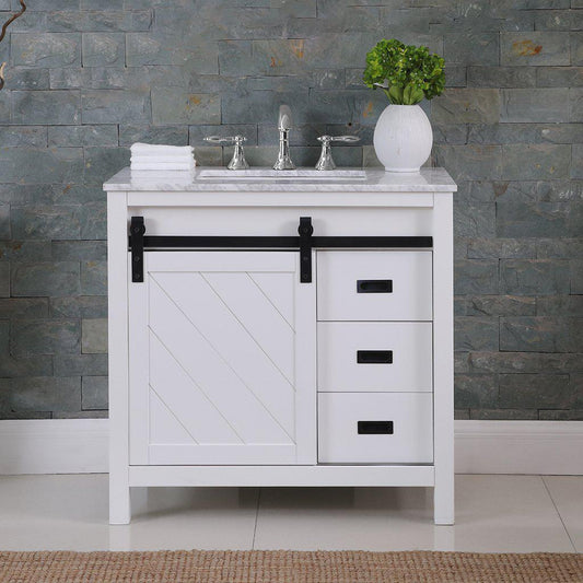 Altair Kinsley 36" Single White Freestanding Bathroom Vanity Set With Natural Carrara White Marble Top, Rectangular Undermount Ceramic Sink, and Overflow