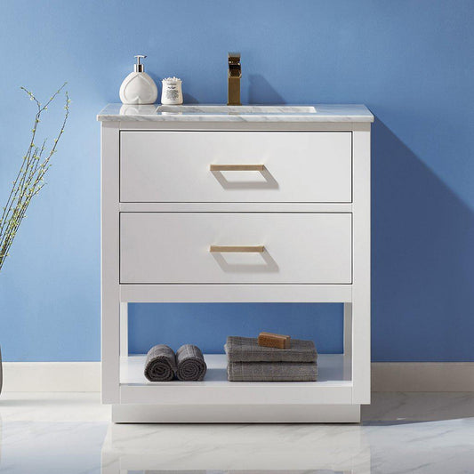 Altair Remi 30" Single White Freestanding Bathroom Vanity Set With Natural Carrara White Marble Top, Rectangular Undermount Ceramic Sink, and Overflow