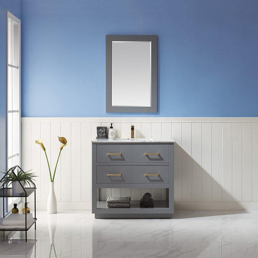 Altair Remi 36" Single Gray Freestanding Bathroom Vanity Set With Mirror, Natural Carrara White Marble Top, Rectangular Undermount Ceramic Sink, and Overflow