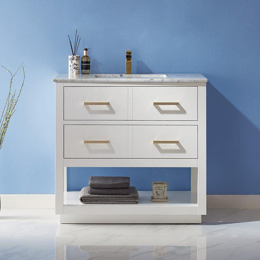 Altair Remi 36" Single White Freestanding Bathroom Vanity Set With Natural Carrara White Marble Top, Rectangular Undermount Ceramic Sink, and Overflow