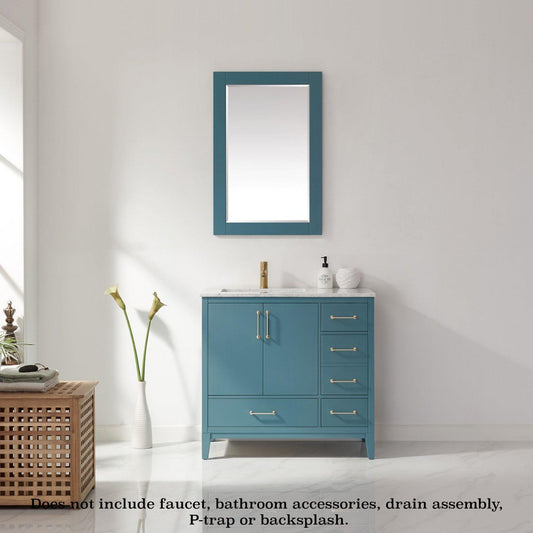 Altair Sutton 36" Single Royal Green Freestanding Bathroom Vanity Set With Mirror, Natural Carrara White Marble Rectangular Undermount Ceramic Sink, and Overflow