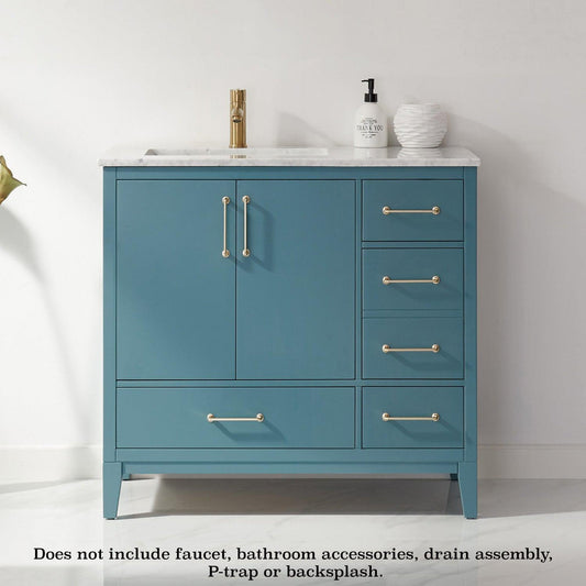 Altair Sutton 36" Single Royal Green Freestanding Bathroom Vanity Set With Natural Carrara White Marble Rectangular Undermount Ceramic Sink, and Overflow