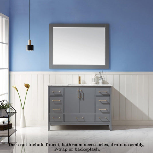 Altair Sutton 48" Single Gray Freestanding Bathroom Vanity Set With Mirror, Natural Carrara White Marble Rectangular Undermount Ceramic Sink, and Overflow